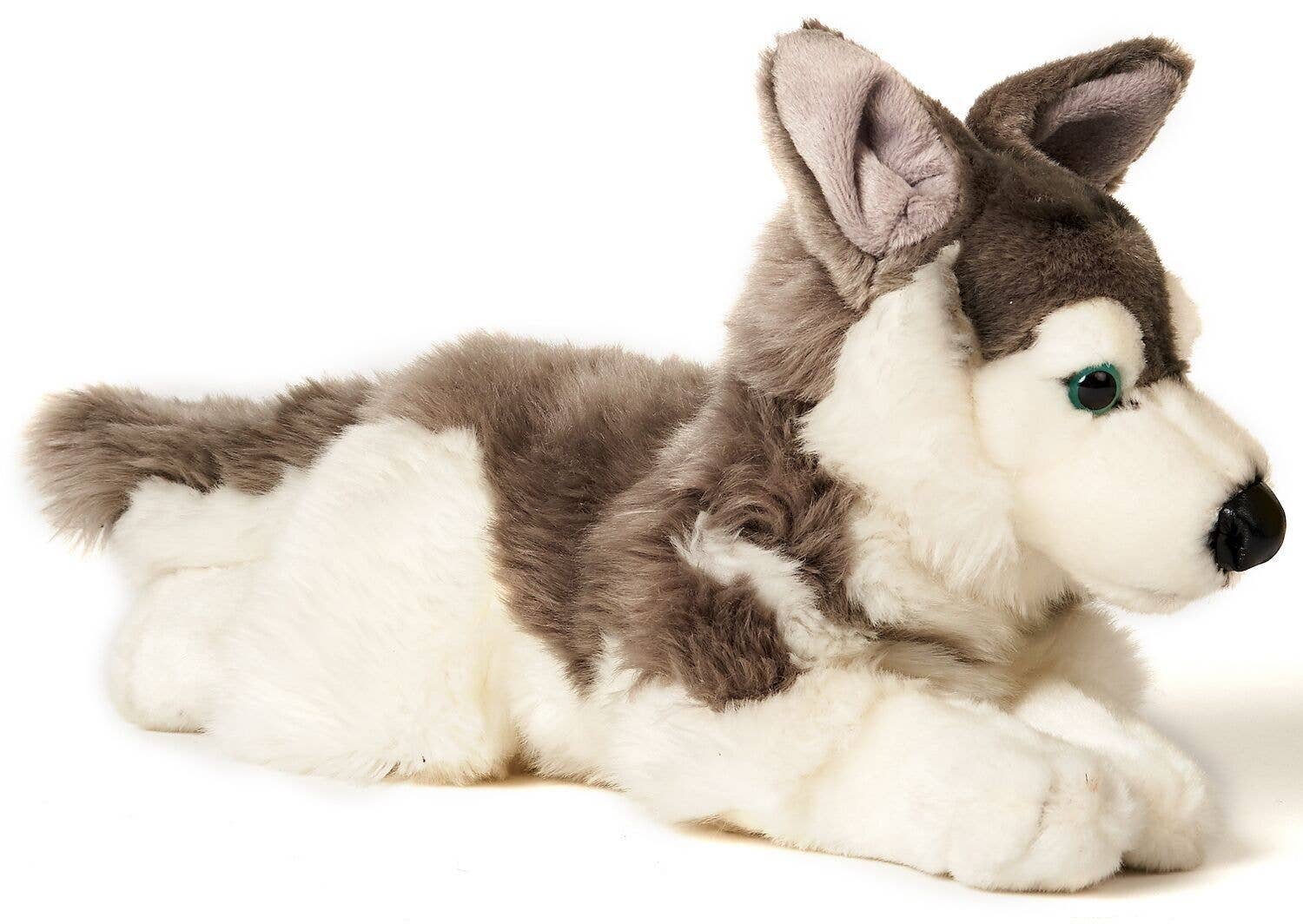 NOM DU PRODUIT : Husky gris, couché - 43 cm (longueur) - Mots clés : chien, animal de compagnie, peluche, peluche, doudou