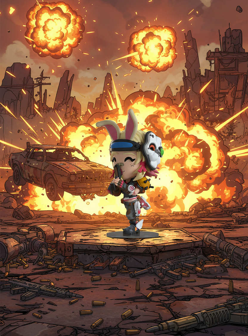 Tina vous a cordialement invité à ses débuts sur Youtooz ! Avec de longues oreilles de lapin tombant vers l'avant sous la visière qui entoure ses cheveux blonds aux pointes roses, un masque de lapin blanc réassemblé se trouve sur le côté de sa tête. Mesurant 5,4 pouces et posée debout sur un pied tandis que l'autre est levé derrière elle, elle tient joyeusement un pistolet vers le haut devant ses lèvres roses et son visage souriant bandé ! Toujours attachée et prête à l'action, elle est couverte d'un mélange d'armures, de munitions et de gadgets par-dessus son haut noir, son pantalon à motifs et ses chaussures dépareillées. L’extérieur de son emballage vous place au goûter de Tina avec des biscuits et des tasses échevelées sur un fond rose sauvage, tandis que l’intérieur est d’un gris foncé orné du logo répétitif du coffre-fort. L'emballage de protection montre Tina posée devant un logo de coffre-fort éclaboussé sur un fond jaune et gris tandis que sa silhouette est visible à travers la grande fenêtre transparente située à l'avant. Cet objet de collection est livré dans une pochette extérieure de protection mate en relief et un protecteur en plastique de taille personnalisée pour une protection maximale pendant l'expédition. Cet objet de collection a été conçu en collaboration avec @therealracckun.
