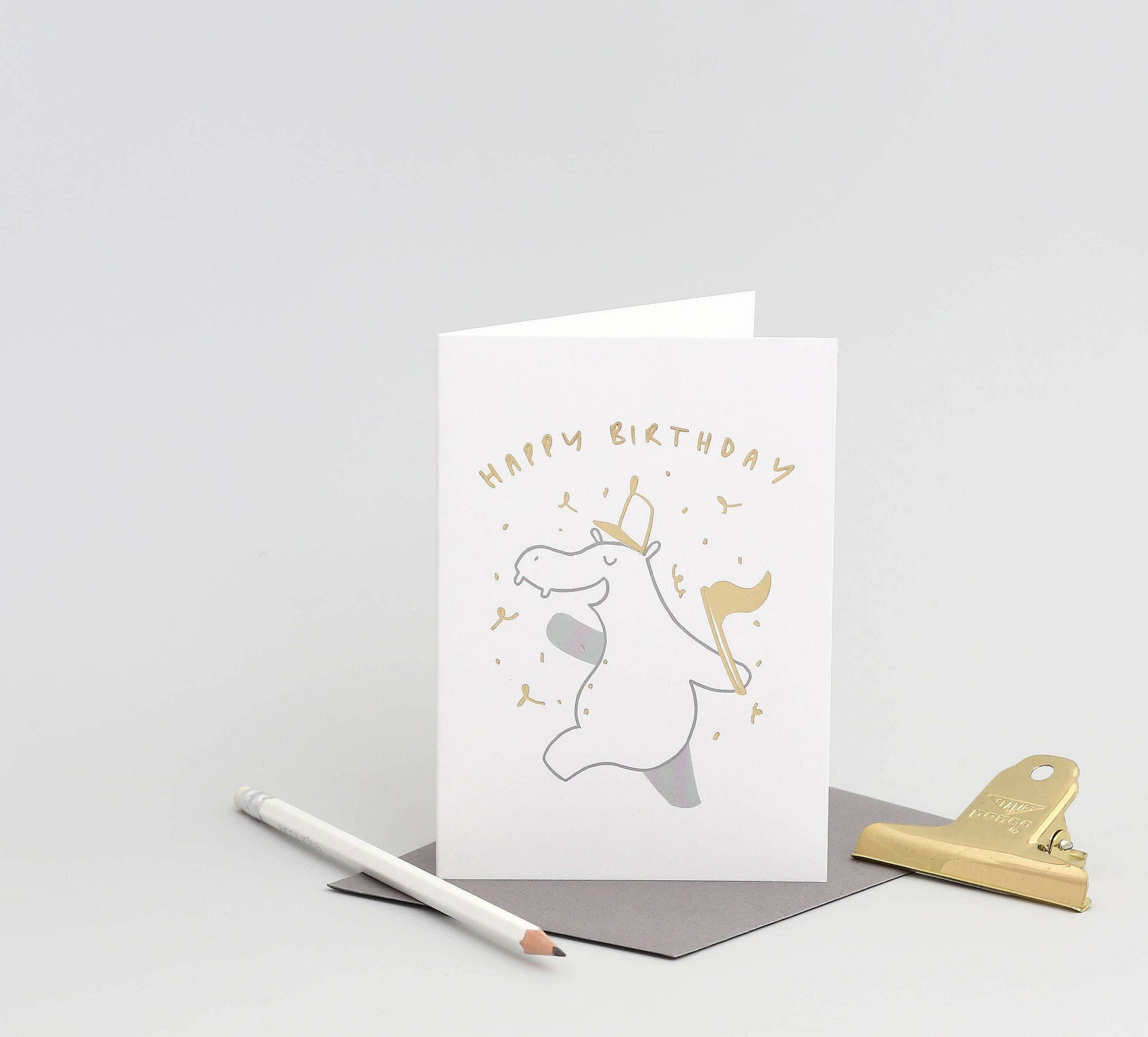 A simple, bold and fun handwritten children's birthday greeting card featuring a fun illustration of a hippopotamus with a fanfare.