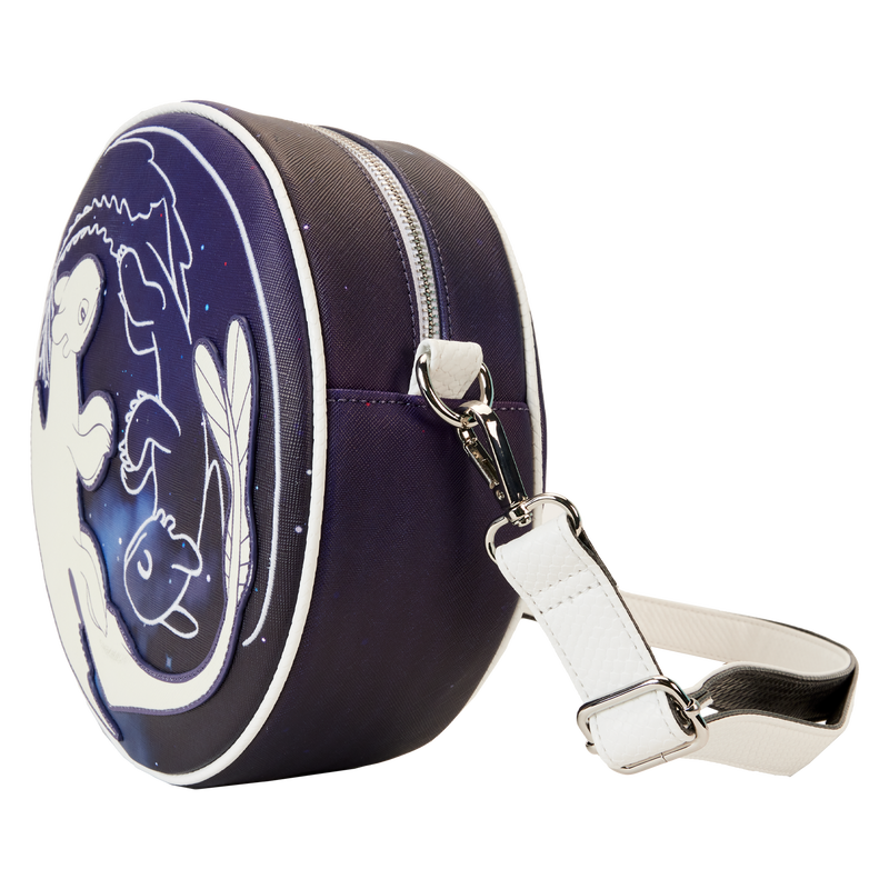 Fly, fly and soar with our Loungefly DreamWorks How to Train Your Dragon Crossbody Bag. This fully figurative circular bag features Light Fury and Night Fury as a Yin and Yang symbol. Light Fury appears as a white applique, and Night Fury's outline, in white, reveals a starry night background. In the dark, all the white parts of Night Fury and Light Fury glow! Along the edge of the circle, the faux leather is textured to add a dragon scale effect, and on the back, Night Fury and Light Fury appear in a dreamy printed illustration. They fly through a star-filled night sky. Carry just what you need for the day to spread your wings and go on an adventure.