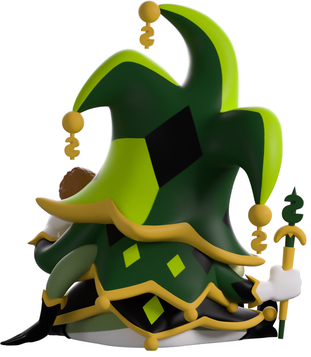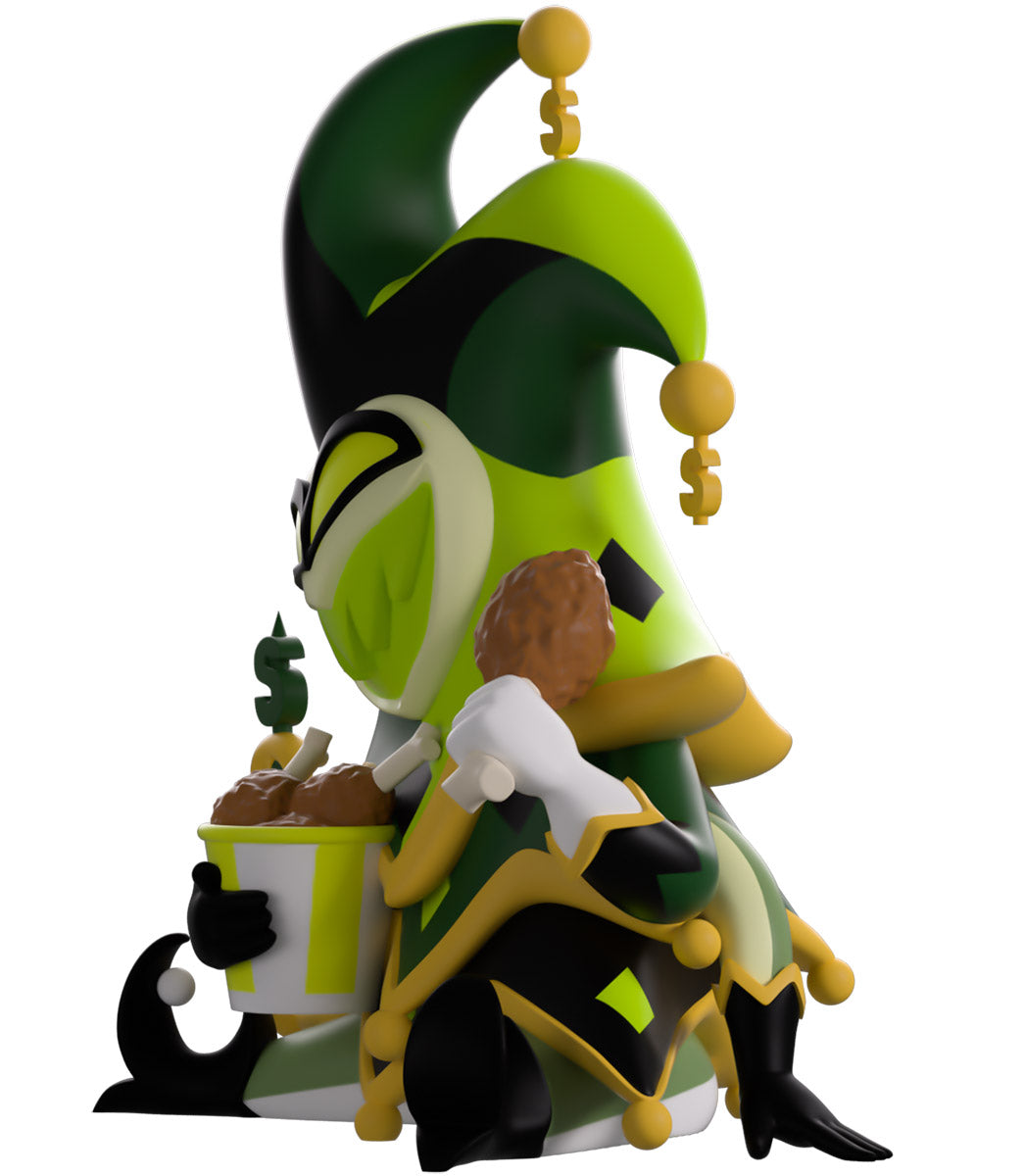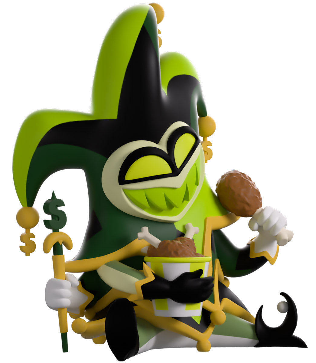 Come quickly! Mammon is here to show off his newest attraction, his Youtooz debut! Sitting at 11.5cm tall with his legs spread wide, a sickly green-toothed grin shines on his heart-shaped face that sits nestled in his tall 3-pointed jester hat with a gold trim and dollar signs hanging from each point. Preparing to devour the meat bone in his raised right hand as he cradles a bucket of food close to his chest, one of his hands holds a gold and green scepter at his side as he wears a layered outfit of pointed green and black robes covered in a pattern of gold diamonds. The outside of his packaging sees their shapely green silhouette set against a dark background, while the inside looks out at a dazzling scene that glows with bright lights. The protective sleeve is then decorated with diagonal green and yellow stripes and printed with the "Helluva Boss" logo while their character is visible through the large clear window on the front. This collectible comes in a protective matte and embossed outer sleeve and a custom-sized plastic protector for maximum protection during shipping.