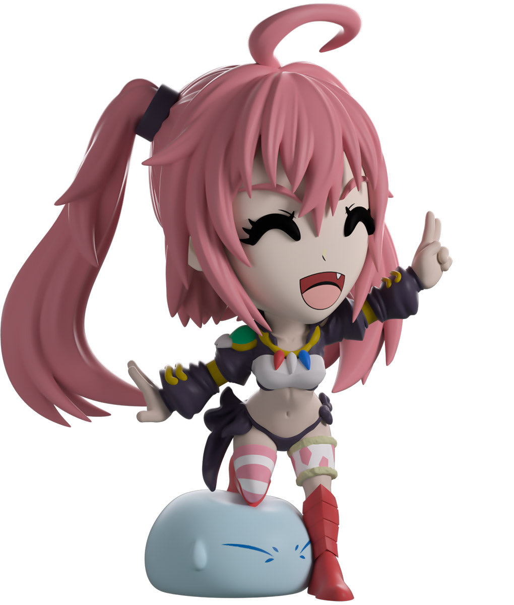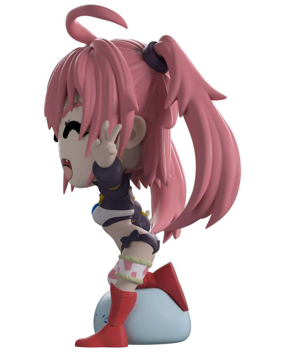 Mirim hid her true identity to sneak into Youtooz and make her vinyl debut, and of course have fun along the way! Making a peace sign with her left hand and kneeling over the wiggly Slime that sits at her feet to stand at 4.5 inches tall, a pair of pink ponytails sprout from the back of her headband to wrap around her sides while a large curl of hair curls from the top and bangs fall around her face. With a wide open smile that reveals a sharp, pointed tooth, her black long-sleeved top is accessorized with gold and jewels while her white torso is cut off to show off her bare midriff. Wearing pink and white stockings on one leg and a patterned garter on the other, her outfit is completed with long, segmented red boots. The outside of their packaging shows Milim Nava accompanied by an adorable slime and floating high in the cloudy sky, while the inside is a repeating pattern of blushing slimes on a deep blue gradient. The protective sleeve is then covered in a blue diamond pattern that runs the length of it, as their silhouette can be seen through the large clear window on the front. This collectible comes in a protective, embossed, matte outer sleeve and a custom-sized plastic protector for maximum protection during shipping.