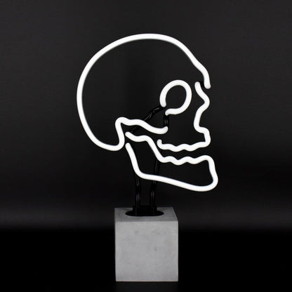 This "skull" neon is a dead favorite. This table neon lamp is handcrafted with real glass neon and is mounted on an elegant concrete base. Fun and unique lighting, defending this true retro neon glow that you cannot beat.