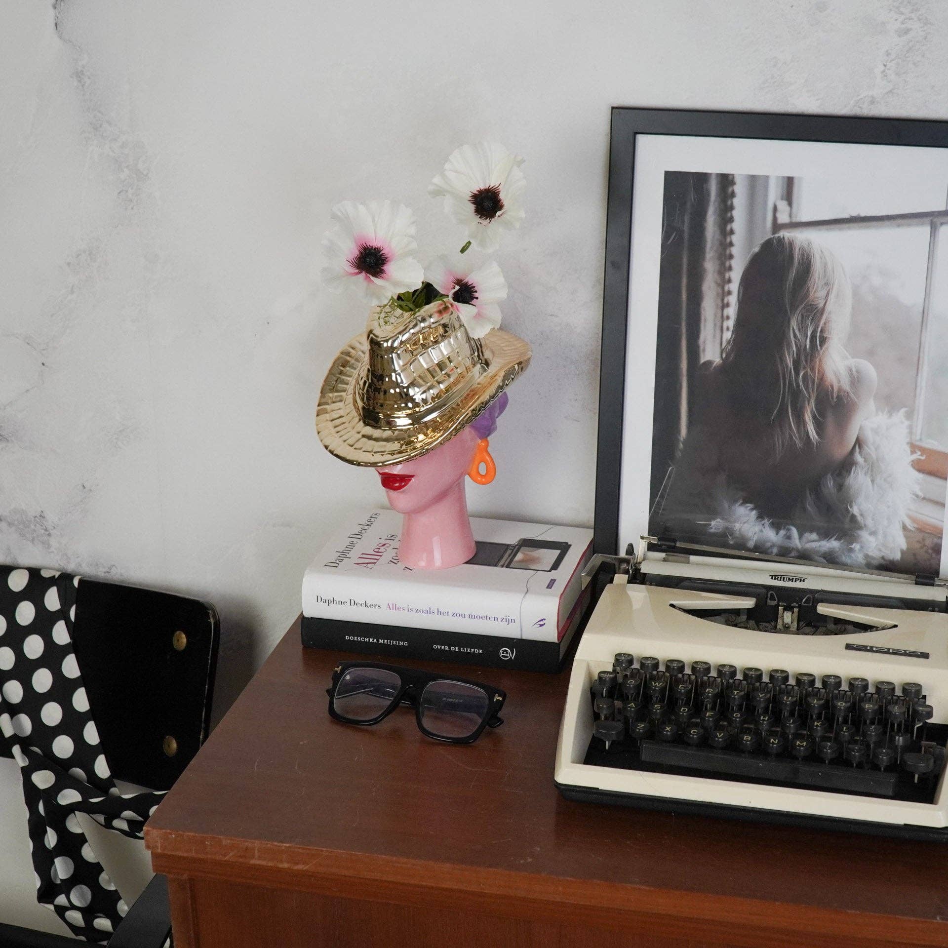 LADY WITH THE HAT – A touch of Western chic for your home! This ceramic vase in the shape of a woman wearing a cowboy hat in lilac and gold (19x16x23.5 cm) is a real eye-catcher. This feminine vase combines artistic design with a bold and feminine touch. The subtle lilac hue combined with the sparkling gold makes this vase an elegant centerpiece that makes your flowers shine even brighter.