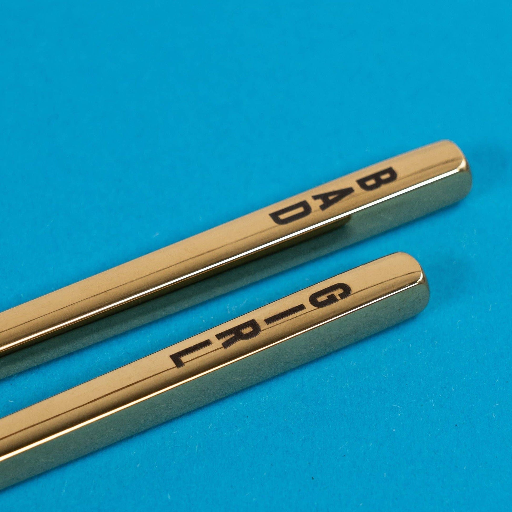 Palillos asiáticos fabricados en acero inoxidable. Grabado láser. Personalización "BAD GIRL".