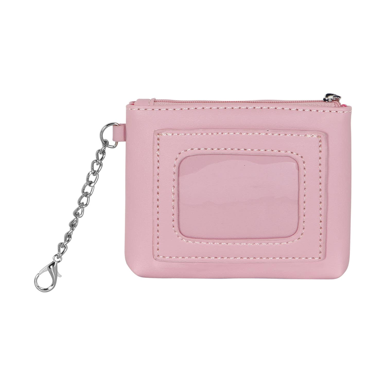 Cartera con ranura frontal transparente para tarjetas. Compartimento principal con cremallera y forro interior. Cadena lateral con llavero.