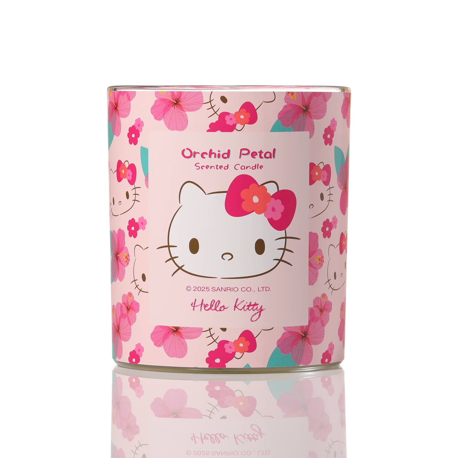 Vela rosa con estampado original de Hello Kitty y aroma a pétalos de orquídea.