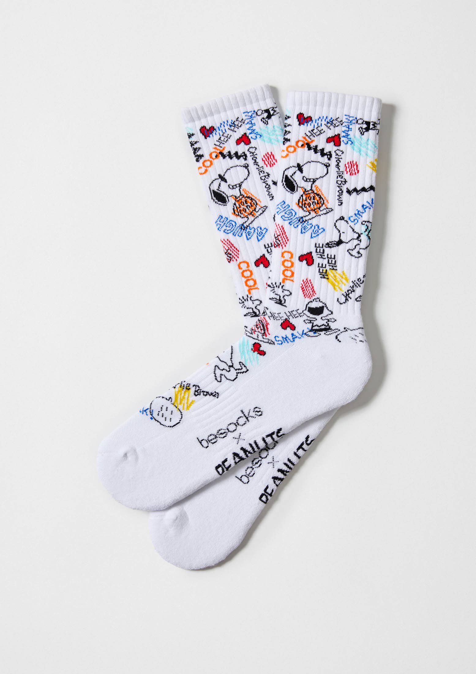 Calcetines deportivos blancos PEANUTS, confeccionados en algodón 100% orgánico. Media caña. Ideales para looks urbanos. Certificación GOTS / Envasado FSC