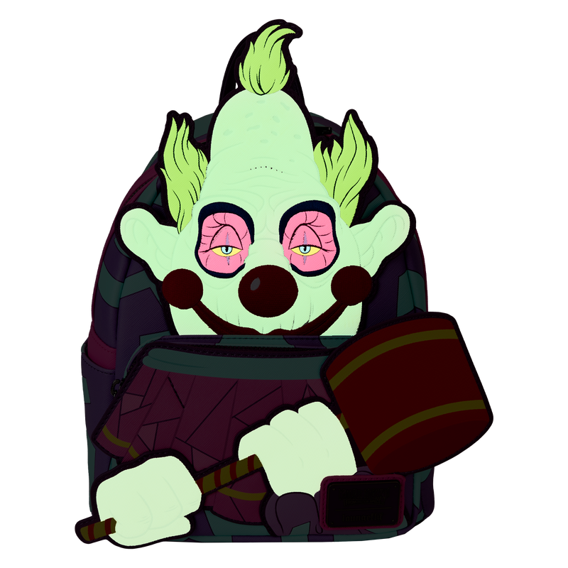 Cuando el circo llega a la ciudad, crea un look espectacular. Tenemos justo lo que necesitas. Nuestra mochila mini gigante de Killer Klowns from Outer Space es un auténtico placer. La extraña cabeza de Jumbo se eleva por encima del bolsillo delantero, que presenta apliques del "volante" de su cuello, y sus manos sostienen un mazo. ¡En la oscuridad, sus manos y su cara brillan! Dale la vuelta a la mochila y descubrirás a Jumbo con el sargento Curtis Mooney, que tiene maquillaje de payaso. Lleva tus artículos esenciales diarios con estilo y ten cuidado con el algodón de azúcar sospechoso cuando viajes.