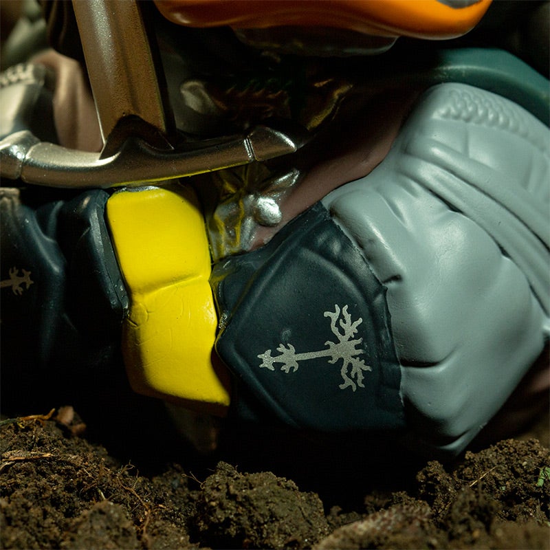 "Si por mi vida o mi muerte puedo protegerte, lo haré. Tienes mi espada ... "El rey llegó al estanque. Armado con la legendaria espada Andundil, Aragorn no muestra miedo a pelear en Mordor por los habitantes de la Tierra de la Medio, ¡incluso como un pato!