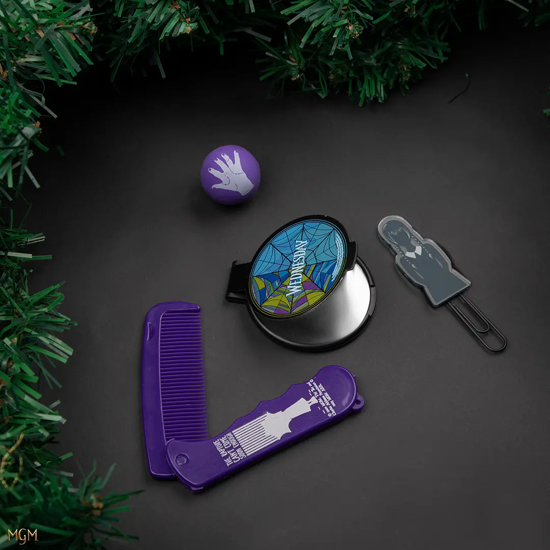 24 artículos: peine, insignia lenticular, espejo, borrador, clip de papel, mini rompecabezas, calcetines, marcapáginas de metal, decoración navideña, colgador de puerta, bloc de notas, parche, marcapáginas magnético, pegatinas, alfileres, soporte para teléfono, imán, bolígrafo, collar, paño de microfibra, cinta métrica, bolso de mano, pelota saltarina, posavasos