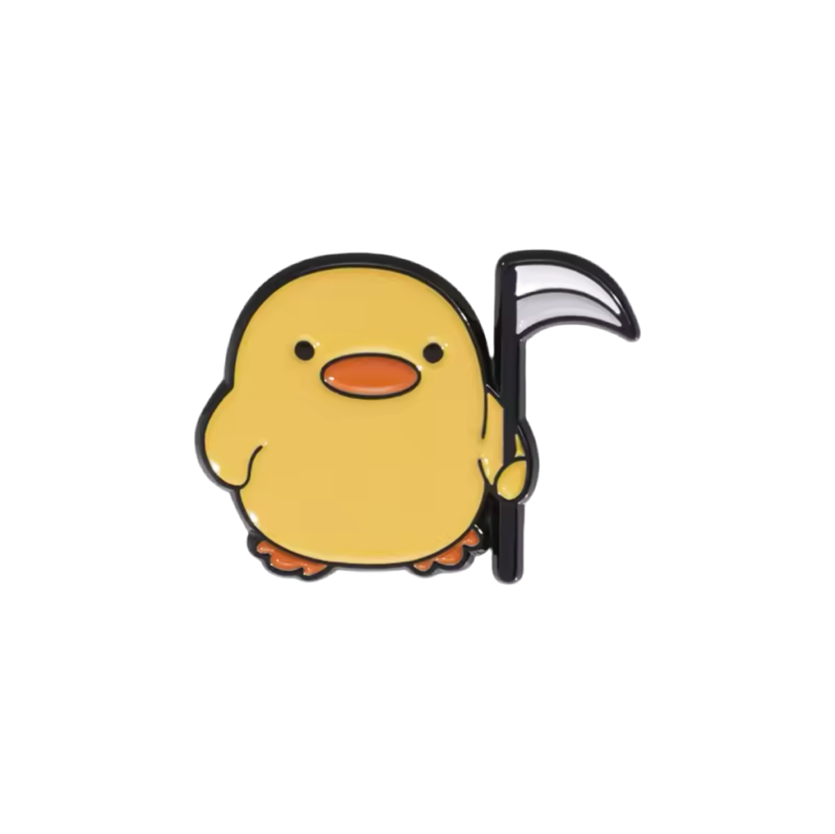 Añade un toque de misterio y audacia a tu colección con este pin de pato amarillo con guadaña . Este inusual pato, armado con su guadaña, evoca un espíritu rebelde y decididamente único, dispuesto a sembrar el pánico con su mirada audaz.