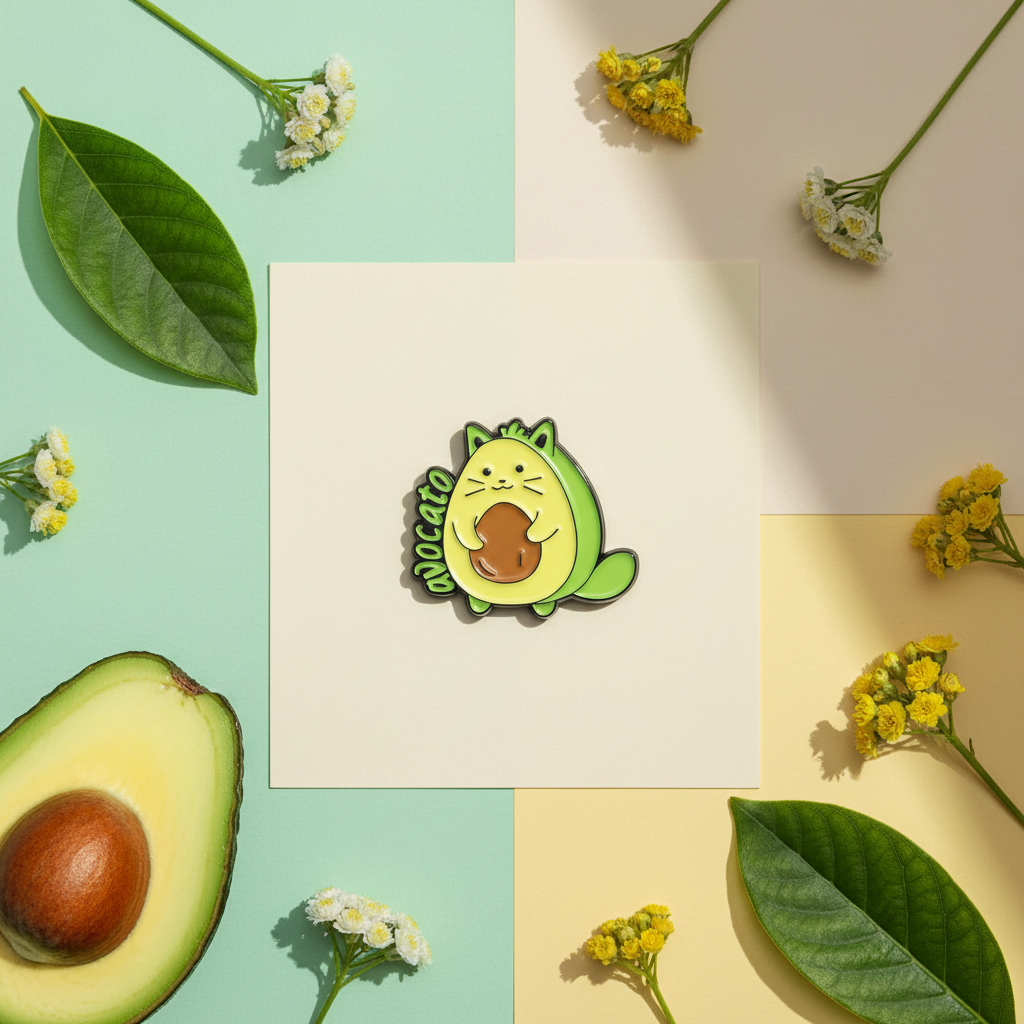 ¡Conoce a Chavocat , el gato aguacate más moderno y lindo que jamás hayas visto! Con su perfecta combinación de gato y aguacate , encarna el equilibrio ideal entre lo lindo y lo saludable . Perfecto para los amantes de los felinos y los superalimentos, este pin añadirá un toque de frescura a tus accesorios.