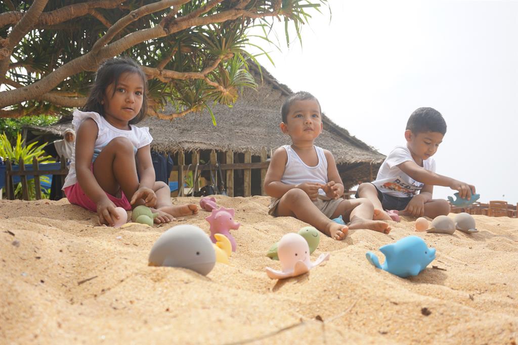 Juguetes de baño y mordedores de caucho natural.