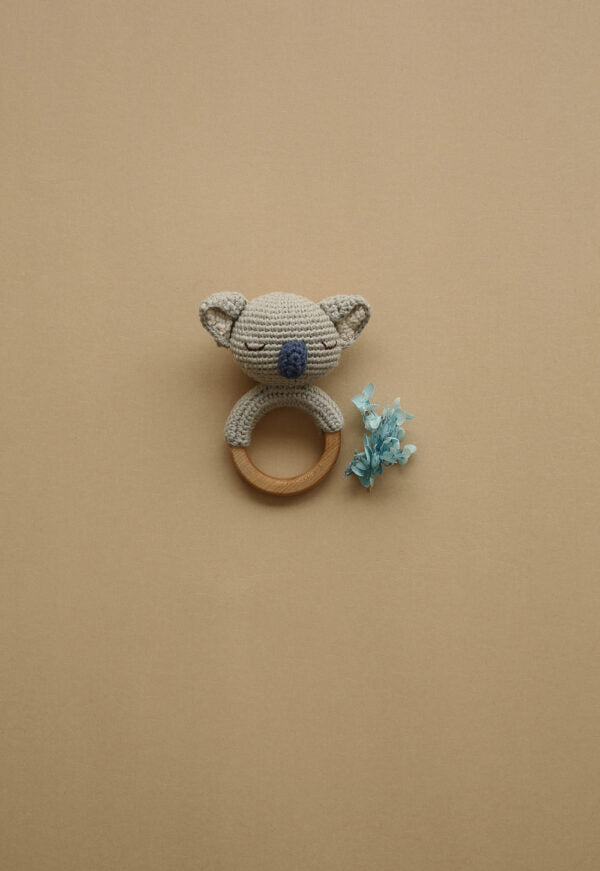 Cet adorable koala a une cloche à l’intérieur qui fait un joli son quand il est secoué. L’anneau en bois est parfait pour soulager les gencives de bébé.