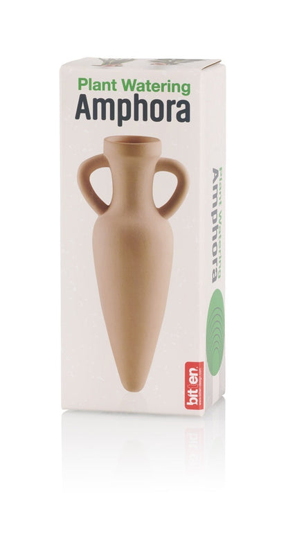 Ce dispositif d'arrosage en céramique a la forme d'une amphore classique. Il retient l'eau et la libère lentement dans le sol grâce à son matériau poreux.