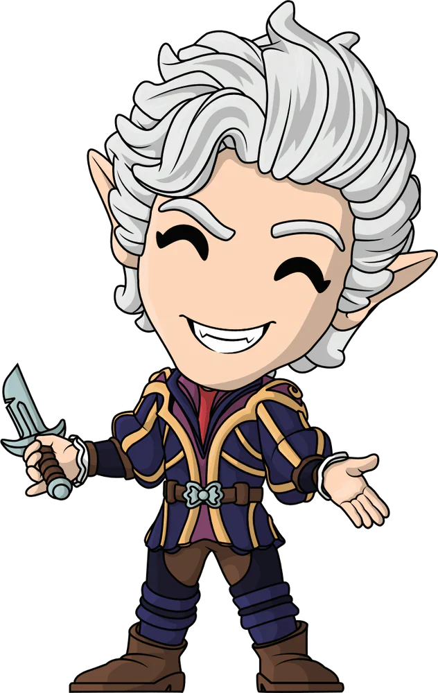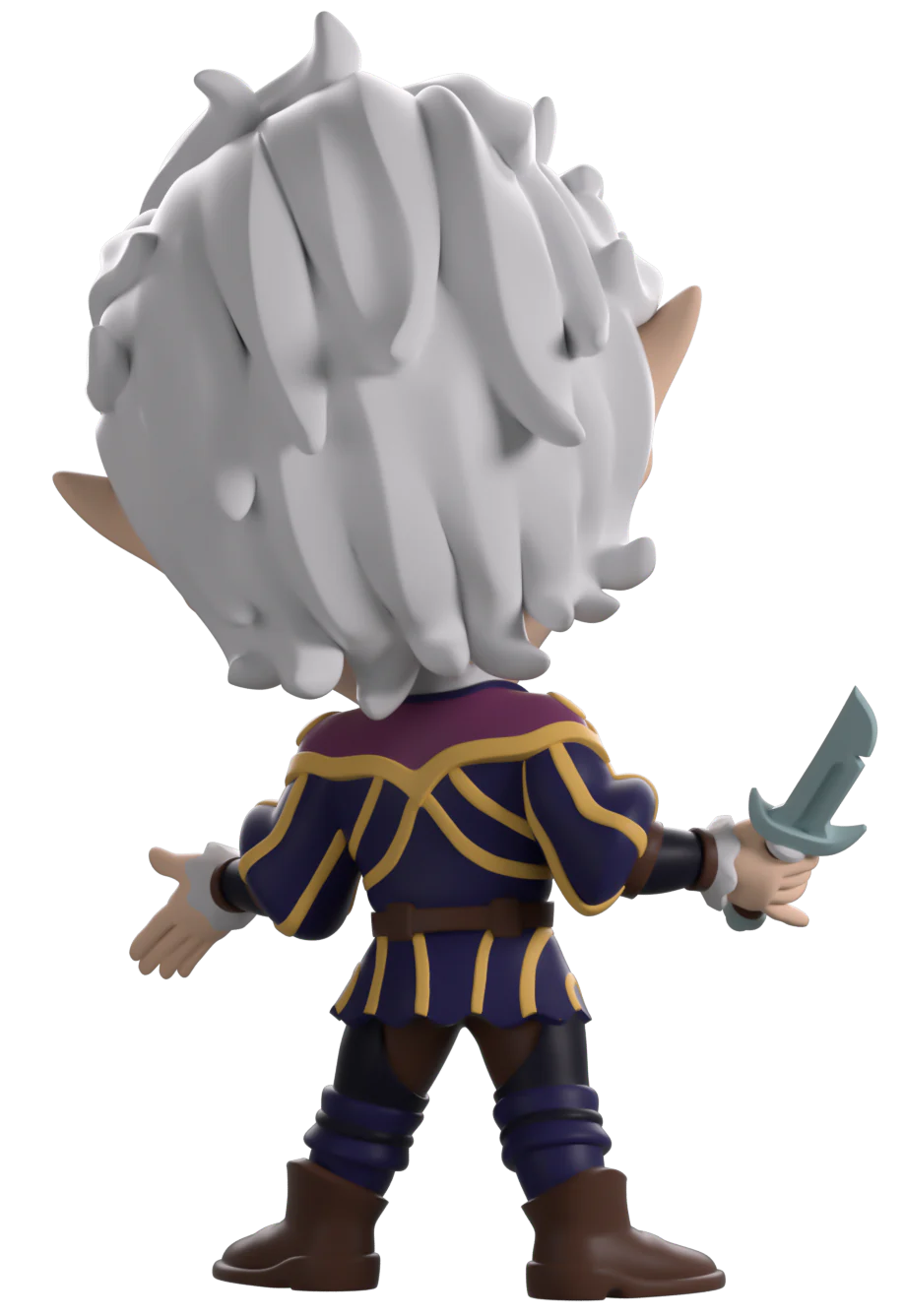 Astarion a rôdé la nuit pendant des siècles pour finalement arriver ici à Youtooz pour ses débuts en vinyle ! Mesurant 13 cm et debout, la tête penchée sur le côté et un sourire narquois traversant son visage sous un sourcil levé, ses cheveux blancs sont repoussés au-delà des oreilles pointues tandis que ses bras sont tendus et qu'il tient un élégant poignard avec un petit doigt allongé. Magnifiquement vêtu d'une tunique bleu foncé aux accents dorés qui est cintrée par une ceinture à la taille sur une chemise rouge à manches bouffantes et aux poignets à volants, son pantalon bleu descend jusqu'à des bottes marron pointues. L'extérieur de son emballage montre Astarion debout devant sa tente dans le camping, tandis que l'intérieur est recouvert de nuages ​​bleu clair sur un fond moucheté sombre. La pochette de protection montre ensuite l'entrée enflammée d'une crypte en pierre tandis que sa silhouette peut être vue à travers la grande fenêtre transparente à l'avant de l'emballage. Cet objet de collection est livré dans une pochette extérieure mate et gaufrée ainsi qu'un protecteur en plastique de taille personnalisée pour une protection maximale pendant l'expédition.