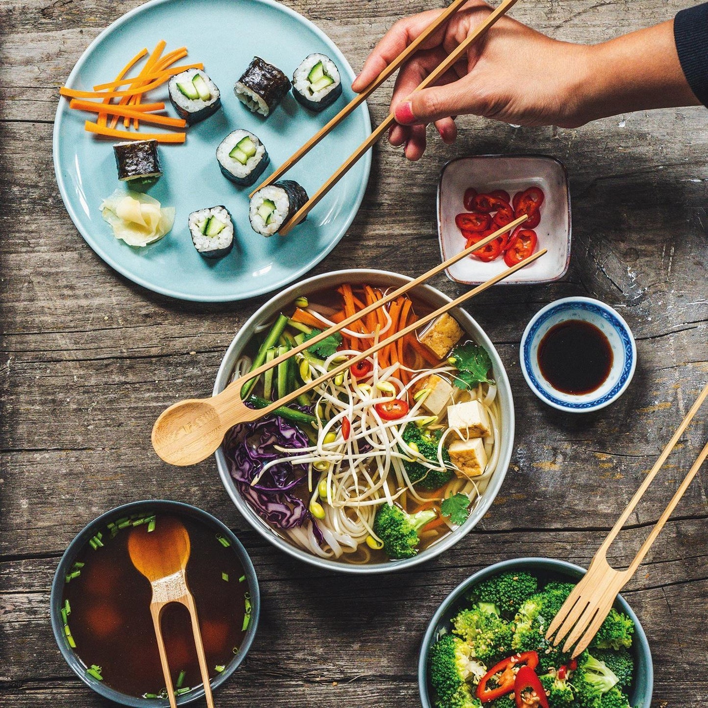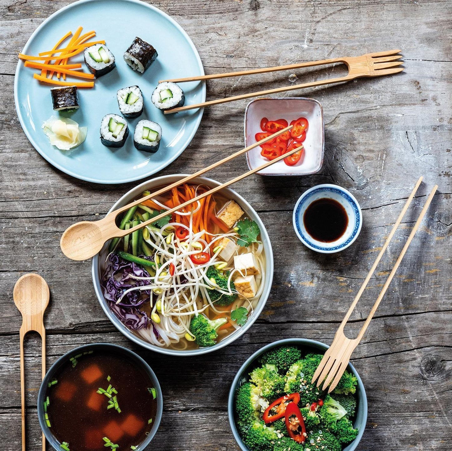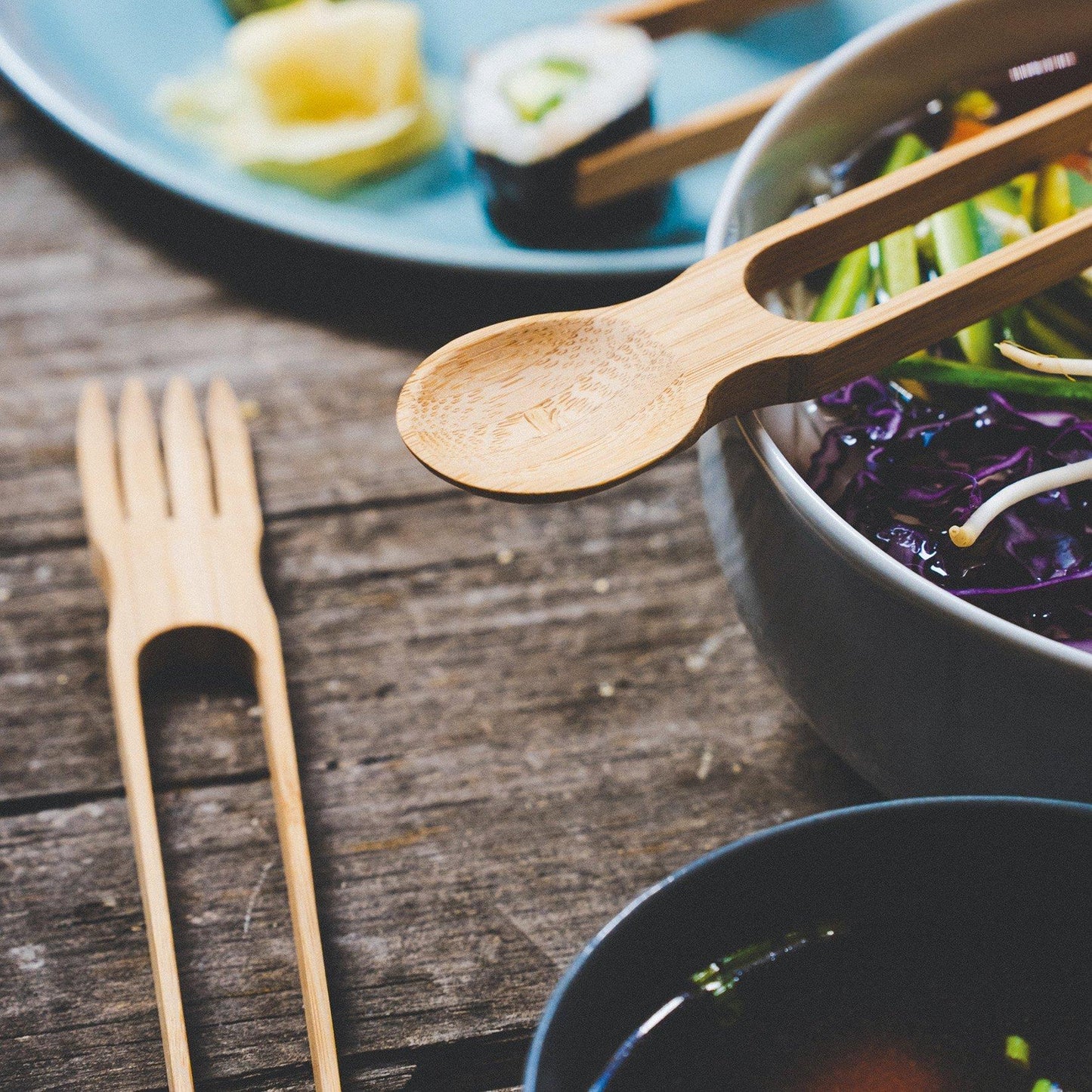 Pour les multitâches - Yummy combine des baguettes, des cuillères et des fourchettes dans deux sets de couverts fins en bambou.