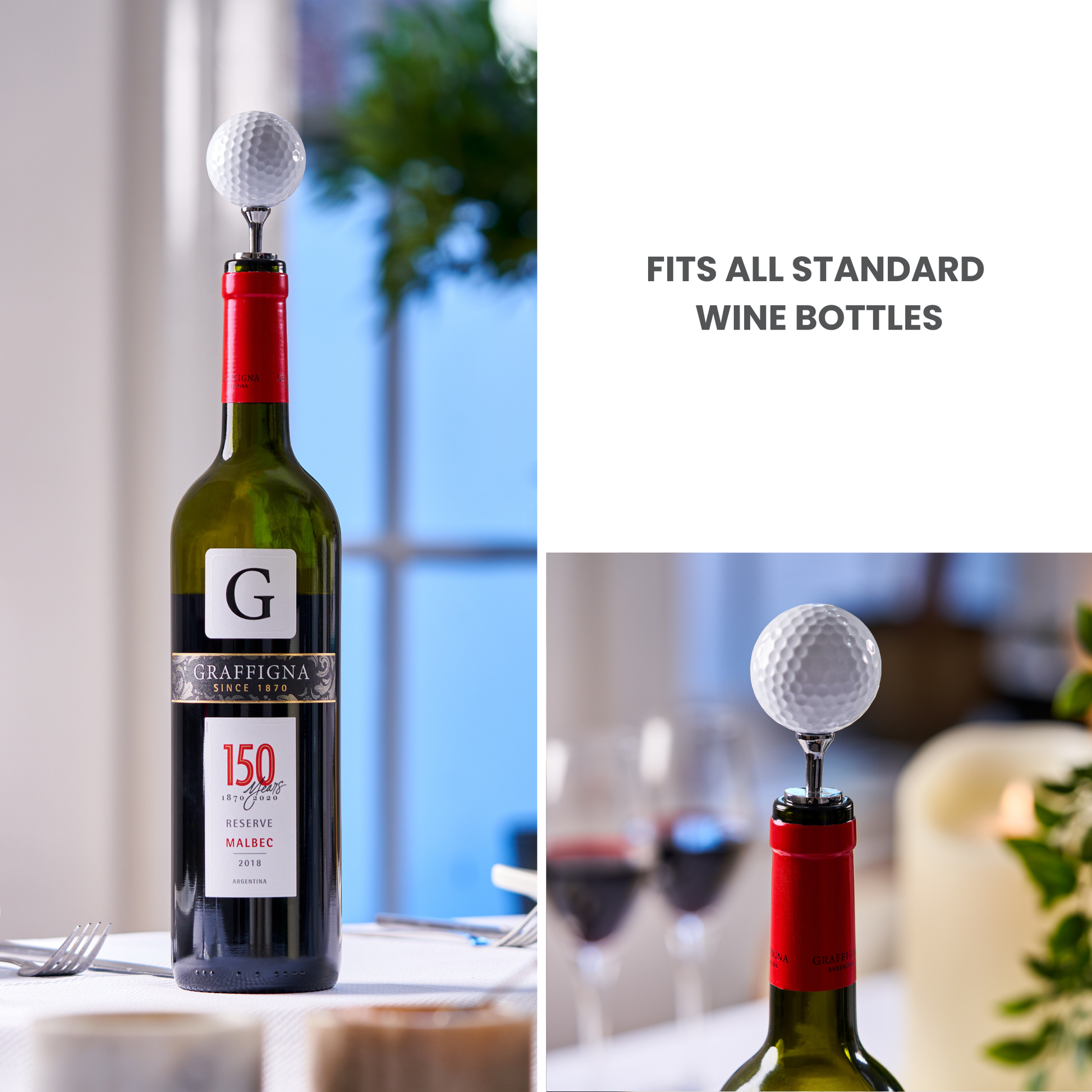Nous savons tous que le golf ne s'arrête pas après 19 trous. C'est le 19e trou que nous apprécions le plus. Asseyez-vous, détendez-vous et ruminez ce putt manqué avec un verre de vin. Le bouchon de bouteille de vin à balle de golf d'Uberstar présente une vraie balle de golf fixée sur un tee en alliage de zinc lourd et un bouchon de bouteille. Il suffit de le placer sur votre bouteille de vin pour la garder fraîche.