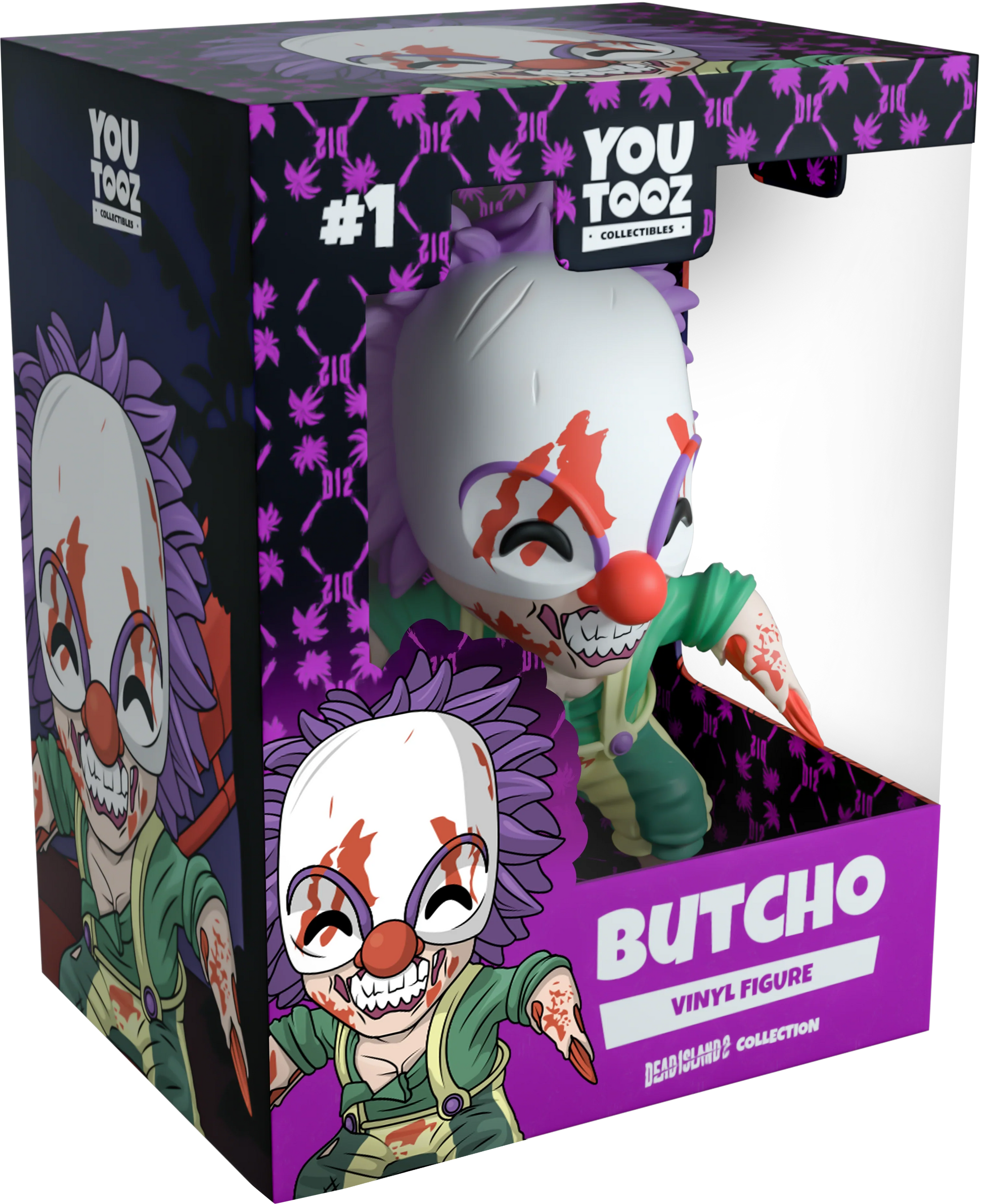 Vous pensez que je peux vous aider ? Butcho le clown découpe et massacre une figurine miniature ! Butcho mesure 10,9 cm et est vêtu d'une tenue de clown échevelée jaune et verte. Ses pieds sont nus, avec une couche de sang sur le bas. Son visage est partiellement recouvert d'un masque de clown blanc avec des cheveux violets dépassant de l'arrière du crâne. Son sourire charnu et denté scintille sous son gros nez rouge. Butcho se tient prêt avec ses bras en pointe de chair écartés. La boîte de présentation vitrée a été illustrée pour présenter un parc d'attractions au crépuscule avec des flaques de sang sur le sol. L'intérieur de la boîte présente le logo Dead Island 2 sur un fond de couleur dégradé. La pochette de protection montre un coucher de soleil depuis la vue au-dessus du panneau Hollywood, avec l'océan s'étendant au loin. Cet objet de collection est livré dans une pochette extérieure mate, gaufrée et protectrice et un protecteur en plastique de taille personnalisée pour une protection maximale pendant l'expédition.