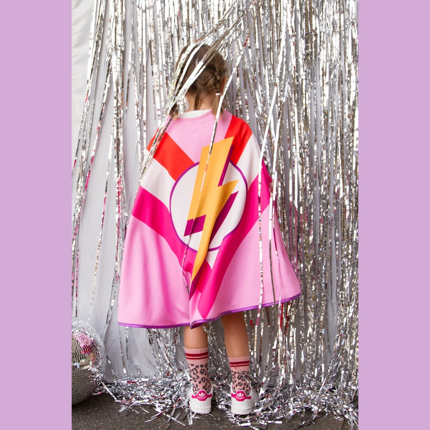 "SCRATCH"... en une seconde, l'enfant enfile sa cape et plus rien ne peut l'atteindre car elle (ou il) court à la vitesse de l'éclair grâce à sa cape aux couleurs pop ! Avec cette cape, on voit la vie en rose malabar et on adoooooore ça ! Irrésistible...