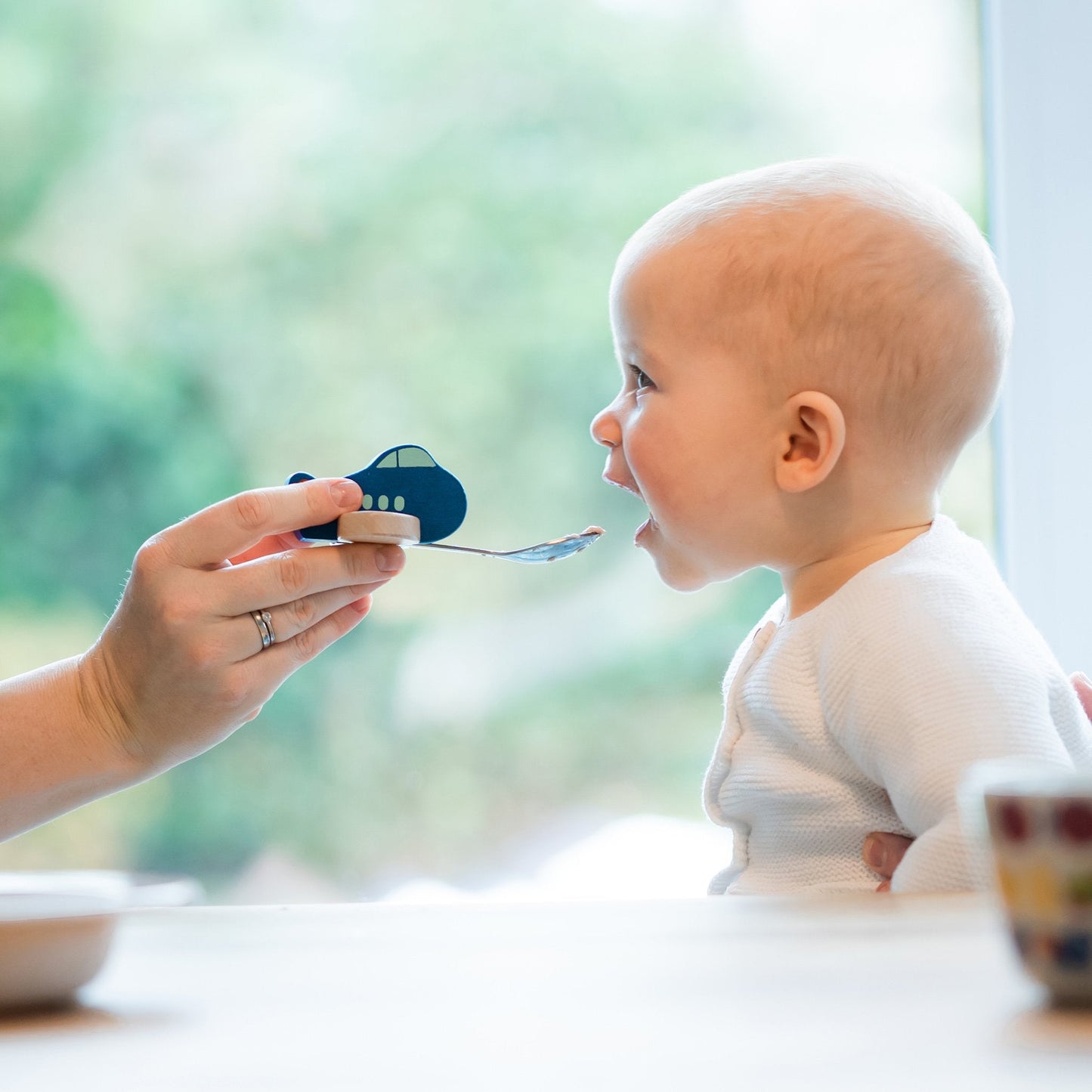 "Mesdames et messieurs, nous sommes sur le point d'atterrir. Veuillez mettre le siège enfant en position verticale et garder la bouche grande ouverte." Terminé! Malgré les turbulences, les petits pois ont atterri en toute sécurité dans votre estomac avec beaucoup de plaisir et grâce à Knatter, l'avion en bois avec une cuillère solidement fixée. Nourrir et manger devient une expérience.