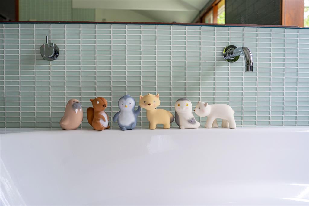 Jouets de bain en caoutchouc naturel et anneaux de dentition.