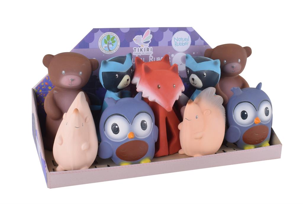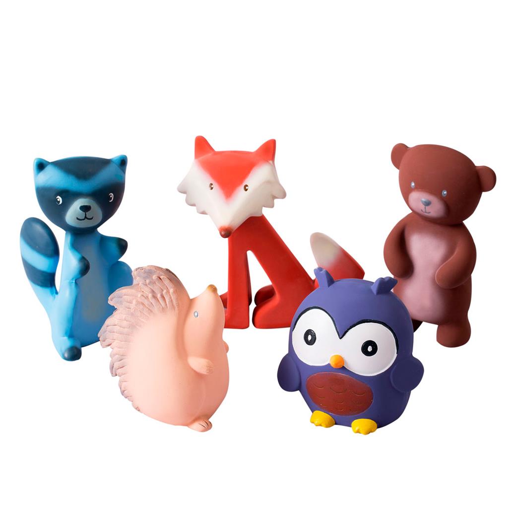 5 Jouets de bain en caoutchouc naturel et anneaux de dentition.