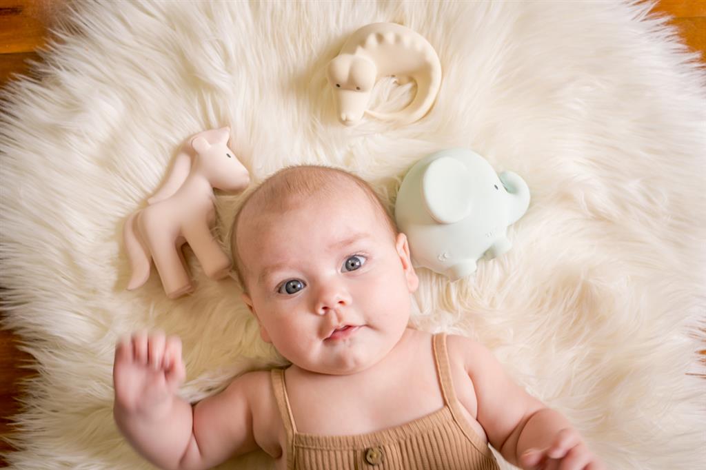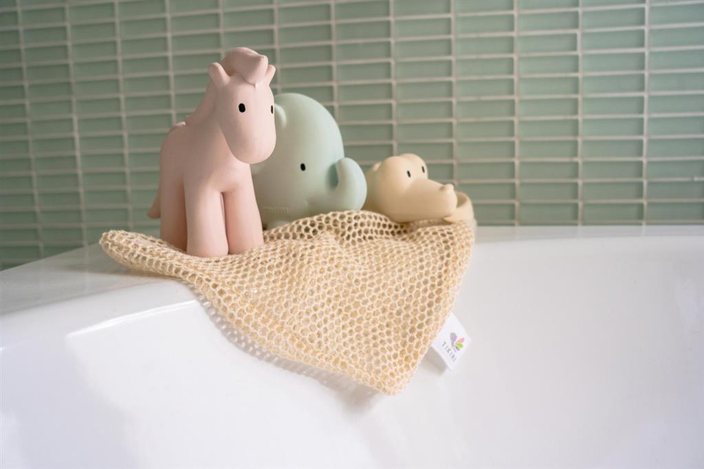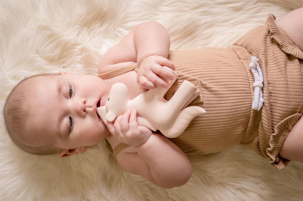 Jouets de bain en caoutchouc naturel et anneaux de dentition.