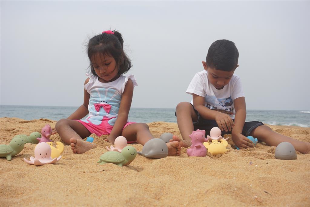 6 Jouets de bain en caoutchouc naturel et anneaux de dentition.