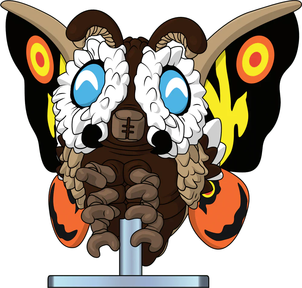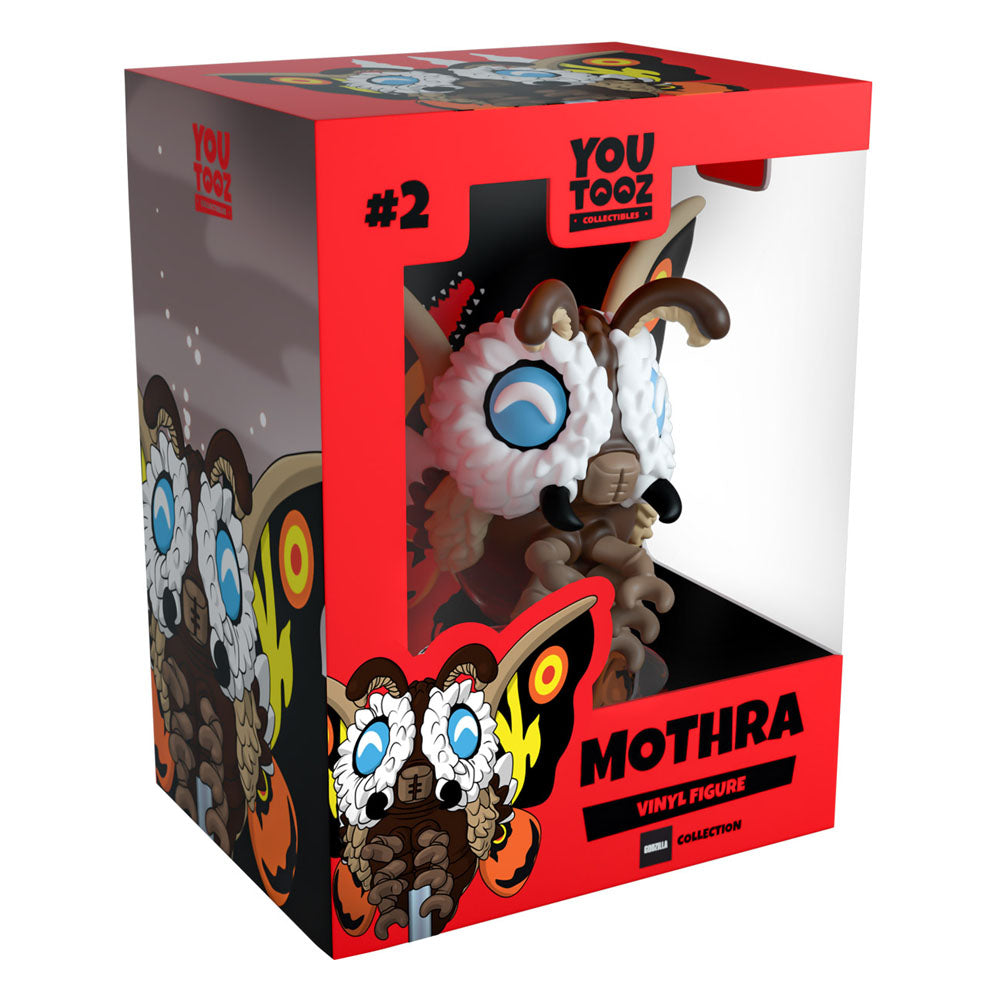 Mothra s'envole vers Youtooz pour rejoindre la bataille ! Souvent un adversaire, mais parfois un allié de Godzilla, cet ancien défenseur de la terre plane à 3,6 pouces de hauteur sur des ailes à motifs noirs, orange et jaunes vibrants. Ses grands yeux bleus brillent à travers l'épaisse fourrure blanche qui entoure son visage et descend son dos jusqu'à un arrière dépouillé. Armée de mandibules noires acérées et de six jambes segmentées qui sont posées vers l'avant, elle se prépare à déchaîner une rafale d'écailles empoisonnées pour mettre fin au combat. L'extérieur de son emballage montre Mothra flottant au-dessus d'un horizon de la ville contre un ciel nocturne brumeux. L'intérieur voit la silhouette noire de Godzilla sur un fond rouge vif. Alors que chaque panneau de la pochette de protection est orné d'images de Mothra, Mecha Godzilla et King Ghidora rappelant les affiches de films classiques.