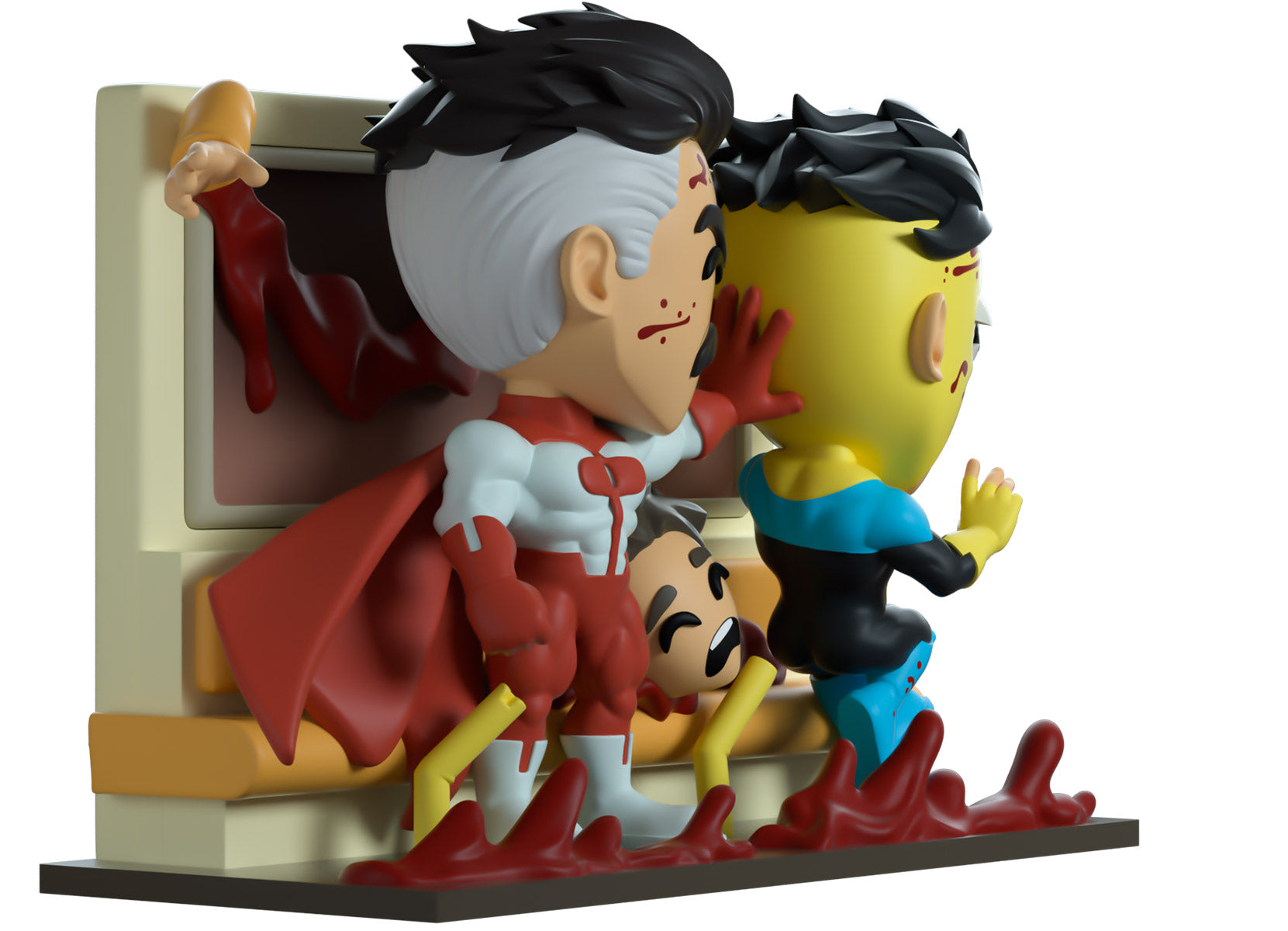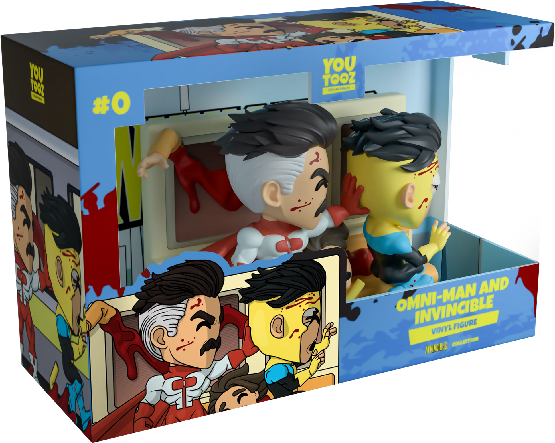 Le combat entre Omni-Man et Invincible fait rage sur Youtooz, laissant derrière lui un sillage de destruction dévastateur ! Du haut de ses 12,5 cm, Omni-Man nous confronte, ainsi qu'Invincible, à la fragilité de la vie humaine. Debout, il saisit fermement l'arrière de la tête d'Invincible et le force à regarder, impuissant, le carnage exploser autour de lui, recouvrant le wagon d'une mer de sang et de membres démembrés. Son corps musclé est visible à travers une tenue rouge et blanche moulante, et le sang ruisselle sur son visage sévère et ciselé. Sa longue cape flotte derrière lui tandis qu'Invincible, paniqué, impuissant et abattu, lève les mains en vain, incapable de faire quoi que ce soit pour arrêter le massacre en cours. Du sang macule son corps bleu, jaune et noir et entoure l'œil droit brisé de son masque. L'extérieur de leur colis contemple la scène horrible depuis l'extérieur d'un wagon. L'intérieur présente un panorama urbain immaculé sous un ciel bleu éclatant qui s'étend sur la pochette protectrice, tandis que les personnages sont visibles à travers la grande fenêtre transparente à l'avant de l'emballage. Cet objet de collection est livré dans une pochette extérieure mate et gaufrée, ainsi que dans une protection plastique sur mesure pour une protection optimale pendant le transport.