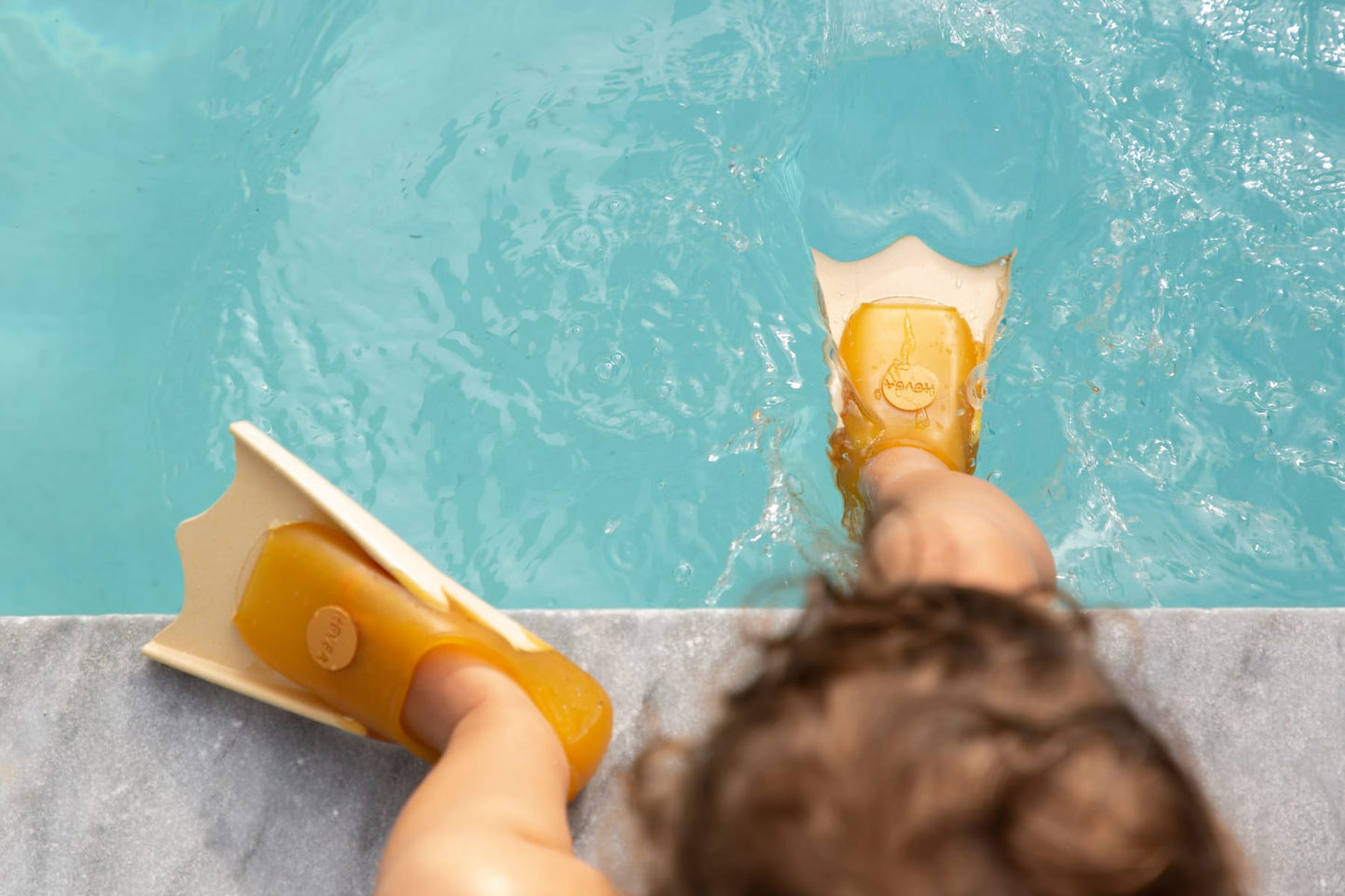En forme de pieds de canard, laissant des empreintes de pas fraîches et mignonnes dans le sable. Nageoire courte pour permettre la marche. Matière douce et malléable la rendant agréable à porter. Les orteils ouverts et la talonnière facilitent l'enfilage et le retrait des palmes.