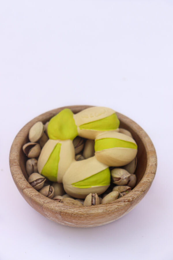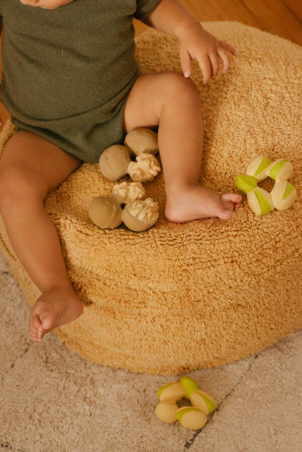 Patricio la pistache : sa forme d’anneau le rend facile à prendre en main et sa couleur vive attirera l’oeil des plus petits.
