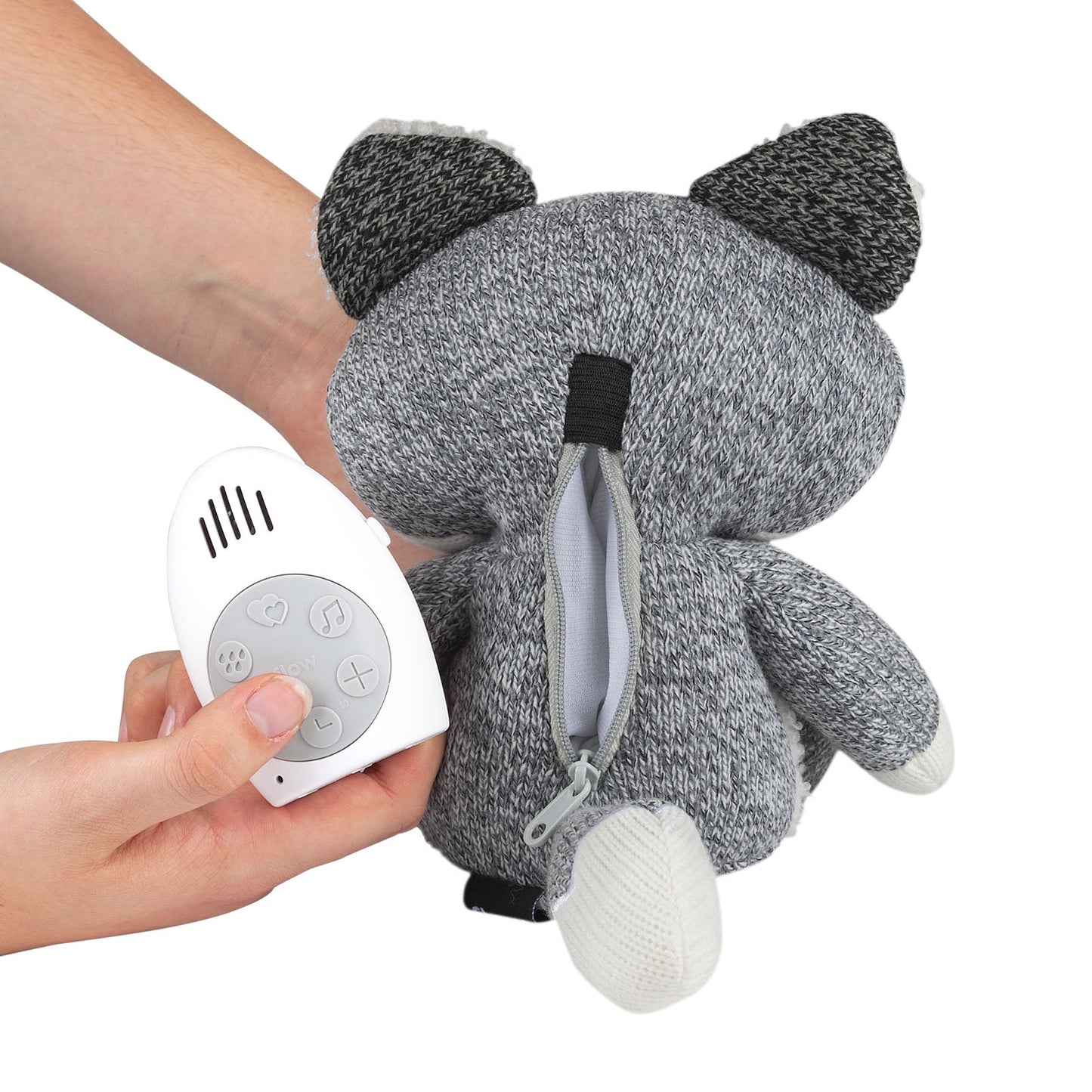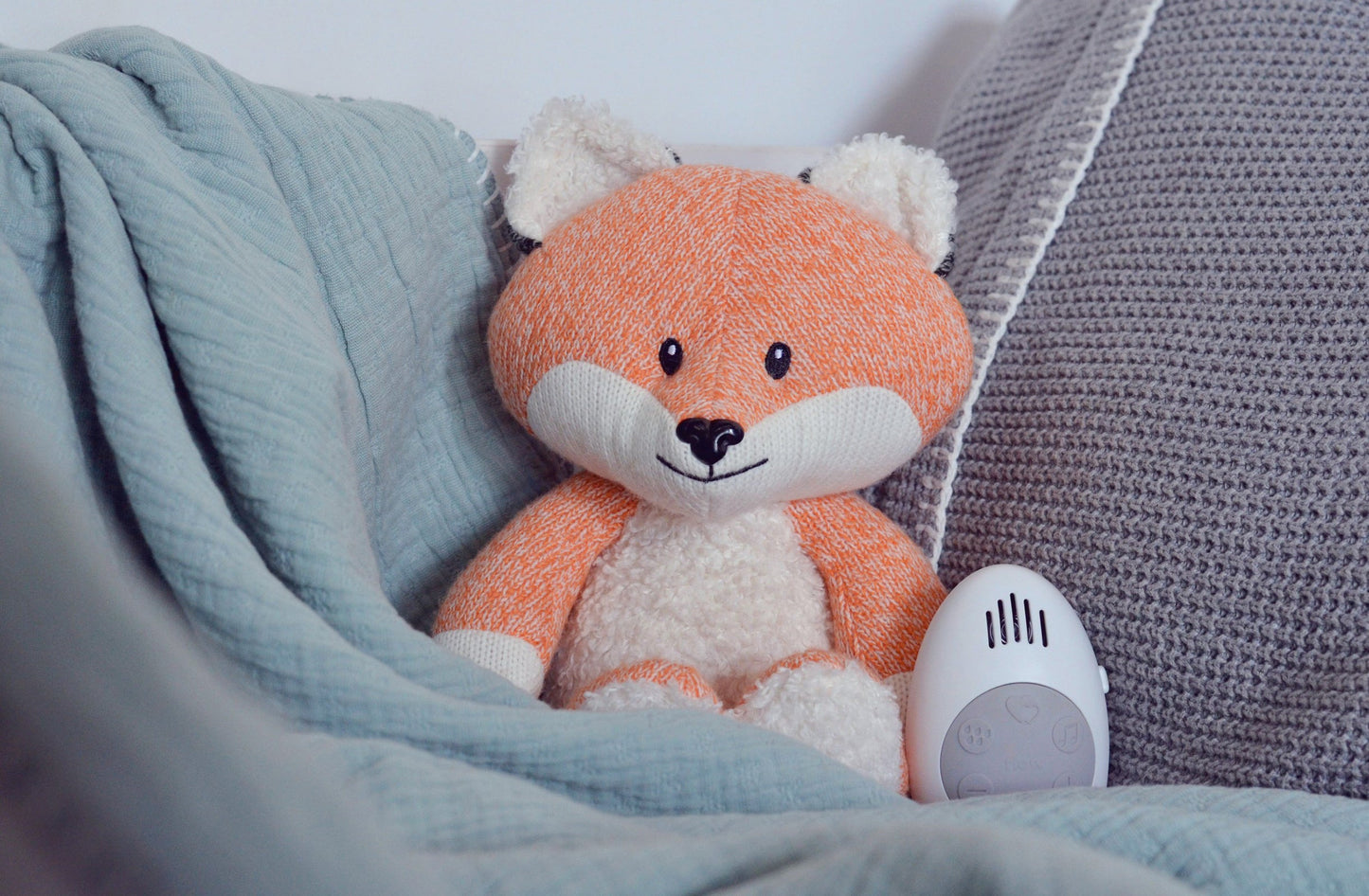 Cette peluche Renard est équipée d’un boîtier qui imite des sons pour conforter votre bébé. Un cours d’eau, le battement de cœur et différentes mélodies. Avec un timer de 15/30/60 minutes, 2 Piles AA (pas inclus). Idéalement positionné à 30cm du bébé, et l’appareil se mets en route après quelque cris.