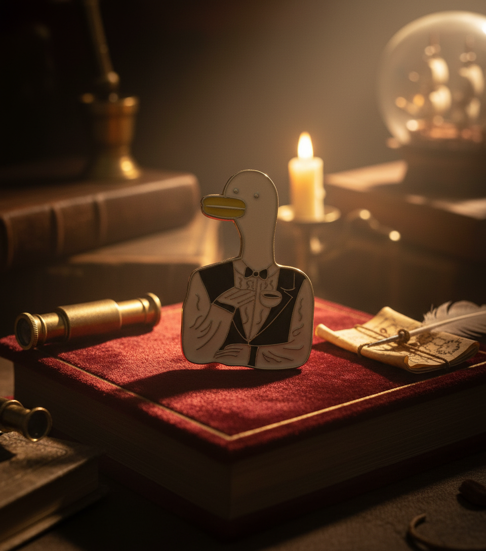 Ce pin’s élégant représente un canard blanc raffiné, habillé en parfait maître d’hôtel, avec un nœud papillon chic et une serviette drapée sur son aile. Idéal pour ceux qui aiment l’humour décalé avec une touche de classe !