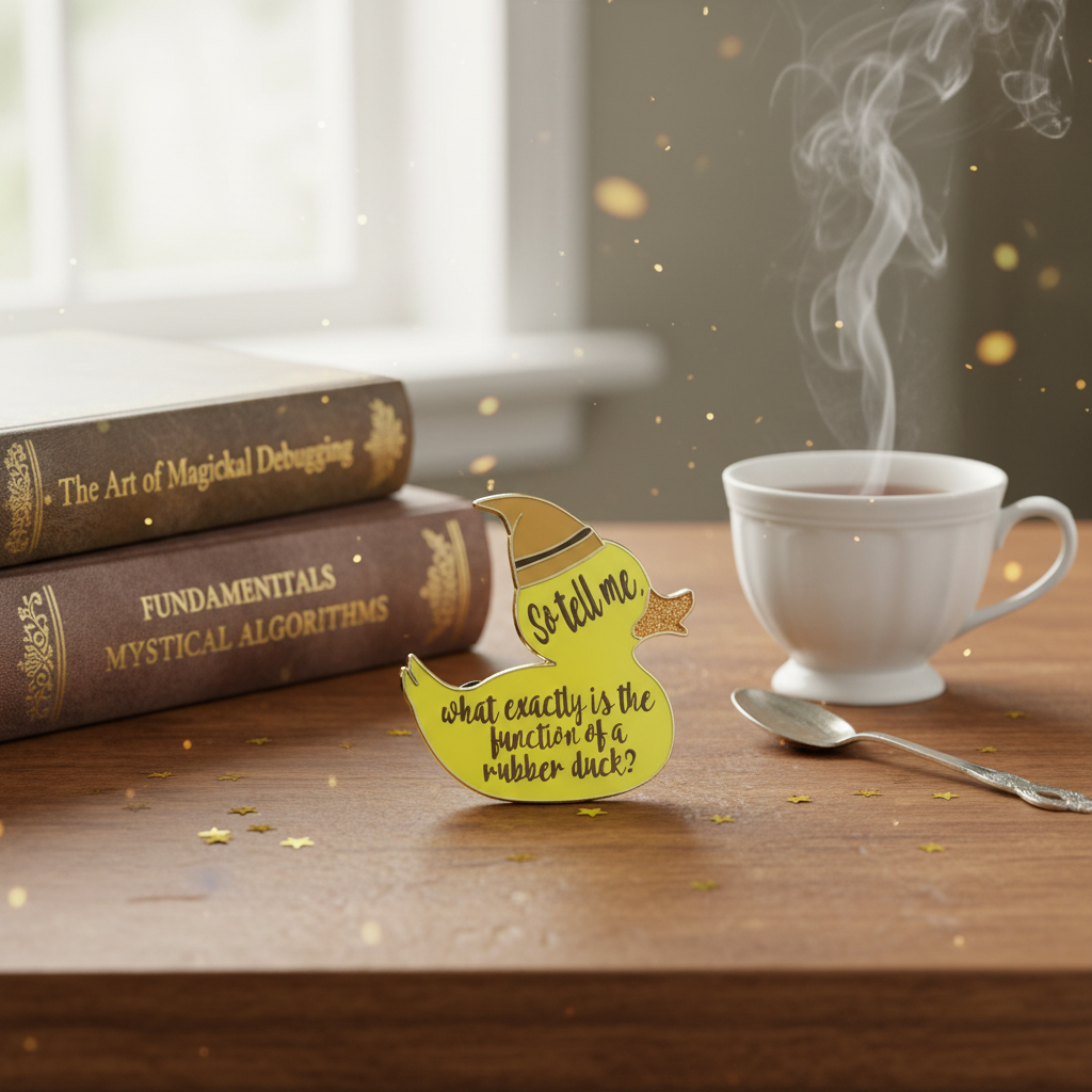Pin's canard jaune avec un chapeau de sorcier et la phrase culte du film Harry Potter "So tell me, what exactly is the function of a rubber duck?"
