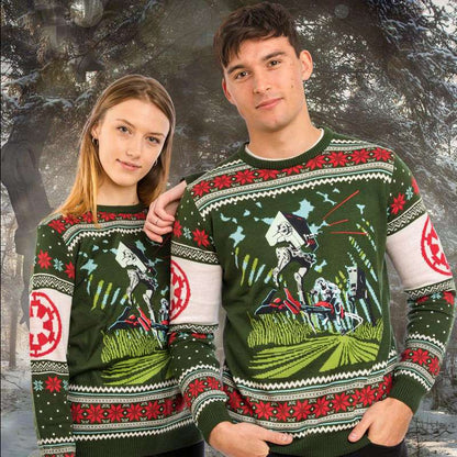 Ressentez la Force de Noël cette année, avec notre gamme de pulls de Noël officiels Star Wars ! Ce pull de Noël représente la tristement célèbre scène de la bataille d'Endor, avec des motifs brodés d'un AT-AT et d'un Stormtrooper en pleine bataille avec les rebelles. Habillez-vous chaudement et fêtez les fêtes (et Noël !) avec nos pulls de haute qualité !