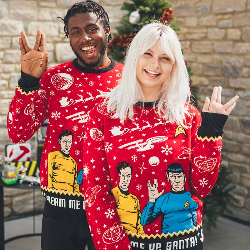 À la recherche d'un extra-spatial, ahem, nous voulons dire un pull Star Trek Chrimbo extra-spécial? Heureusement pour vous, vous n'aurez pas besoin de voyager dans un univers alternatif pour en obtenir un. Diffusez un bon message de Noël et dites à vos proches de "vivre longtemps et prospérer" avec ce superbe vêtement d'hiver. Présentant les héros de l'Enterprise Captain Kirk et Spock sur le devant, c'est le chandail de Noël idéal pour tout amateur de Trekkie.