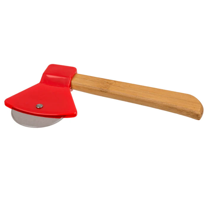 Coupe-pizza en forme de hache 🪓 env. 18 cm, bambou et acier inoxydable, sur carte blister