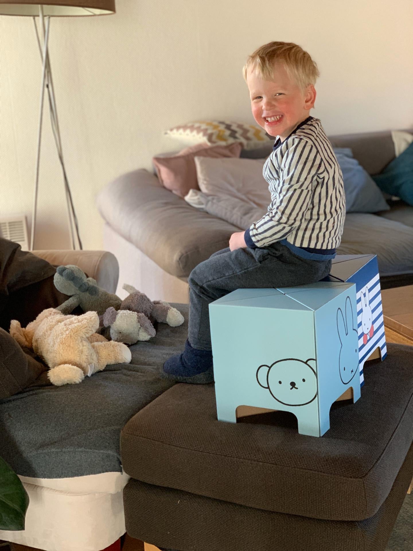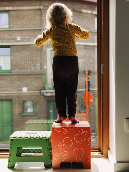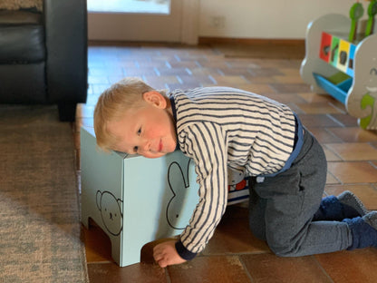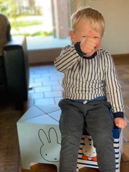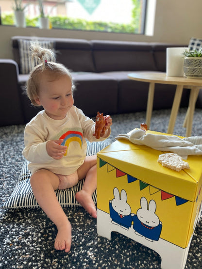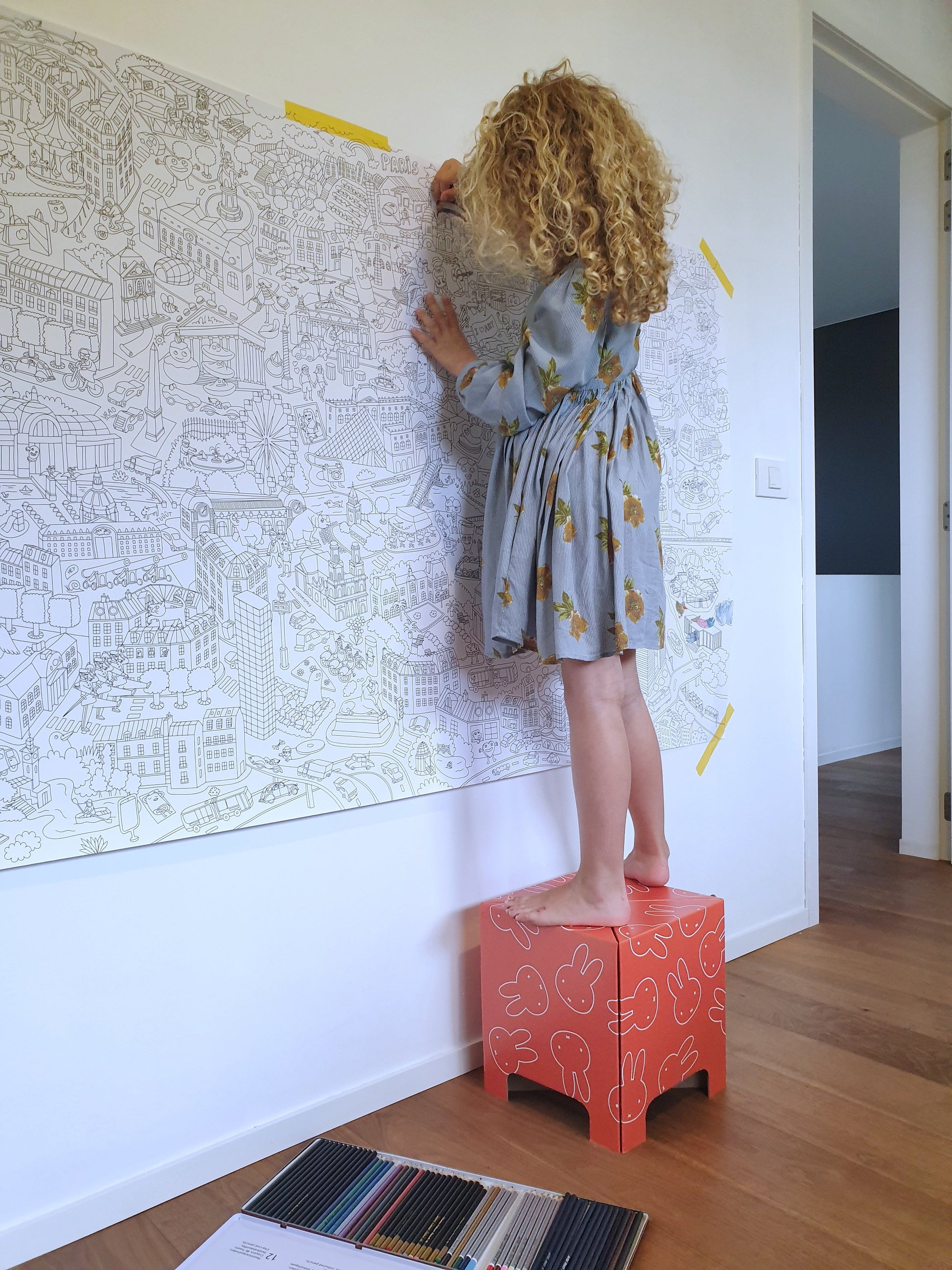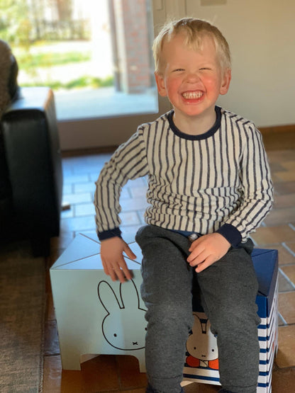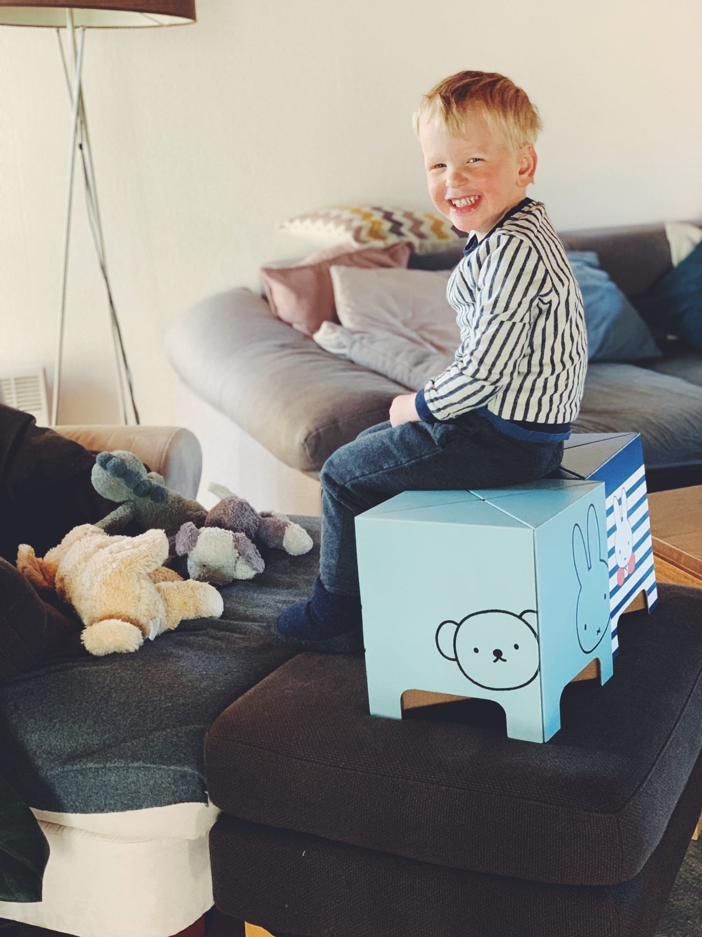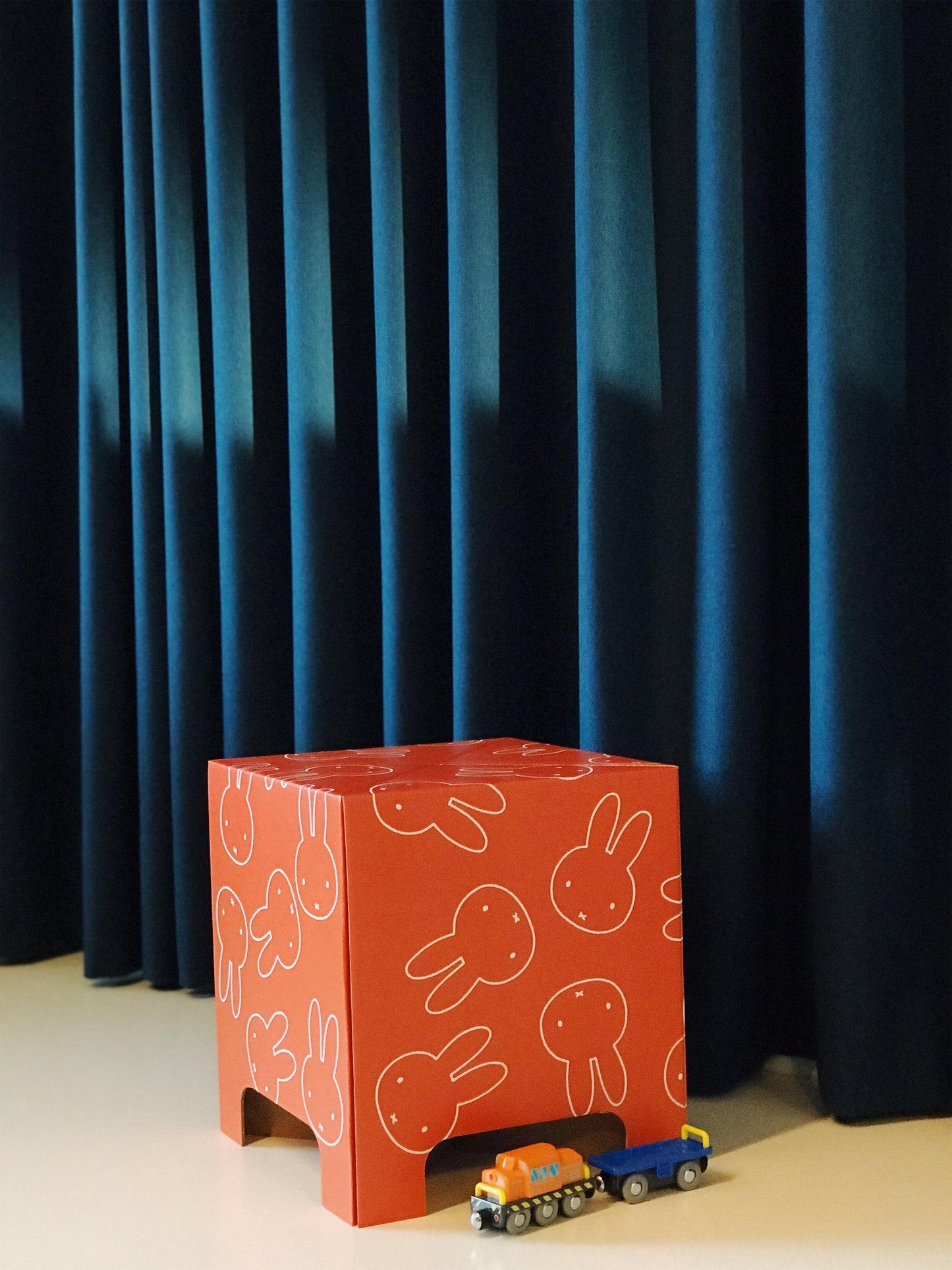 Un tabouret en carton à construire avec Miffy. Parfait pour décorer la chambre d’enfants, et très pratique. Made in Belgique.