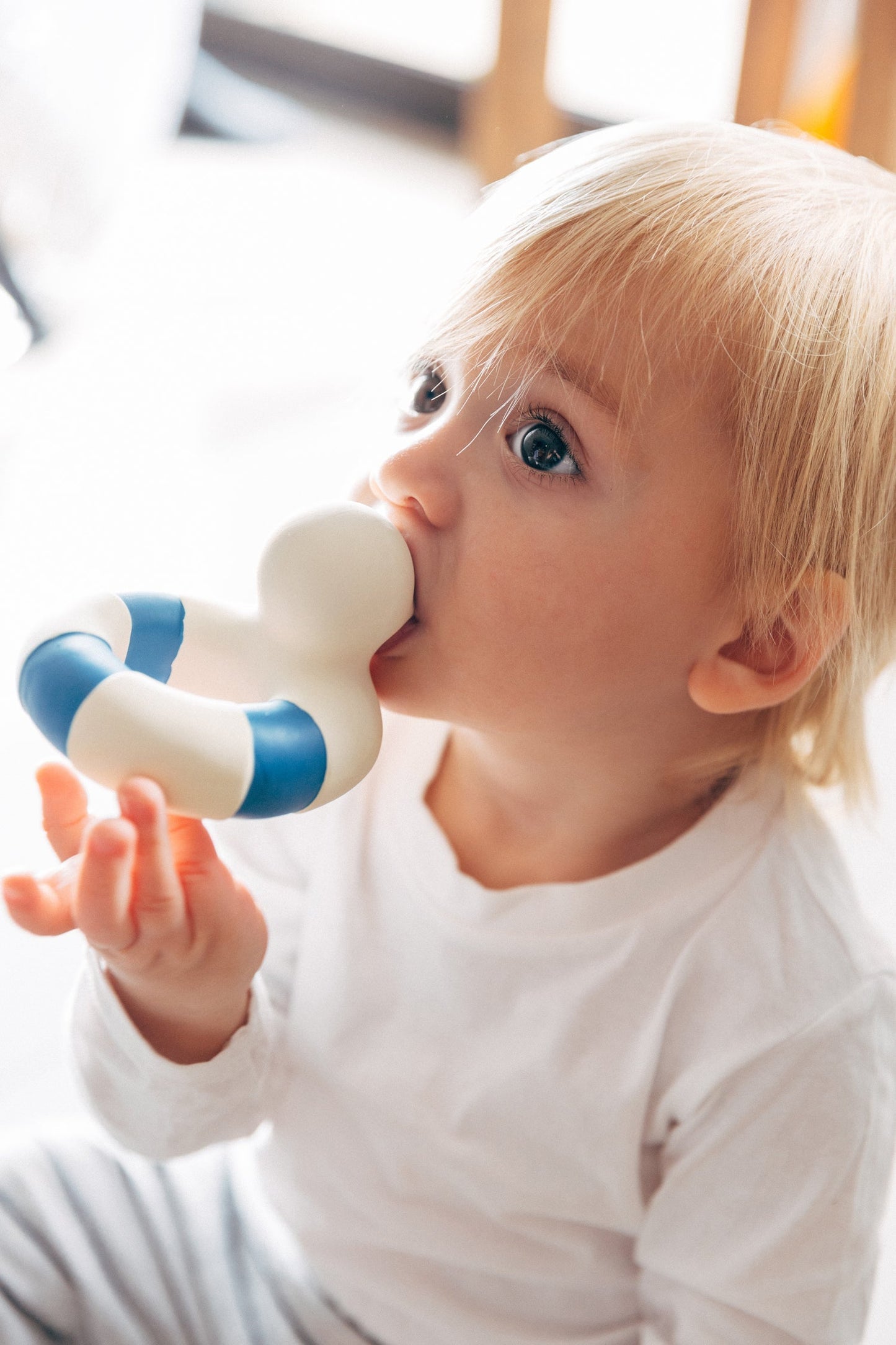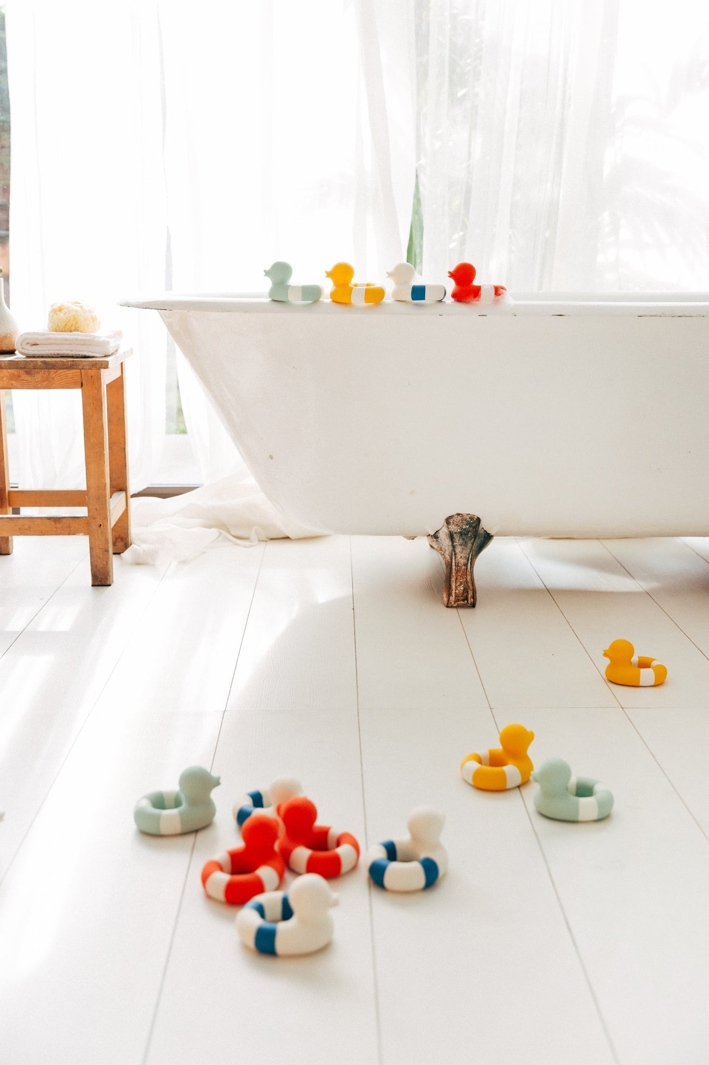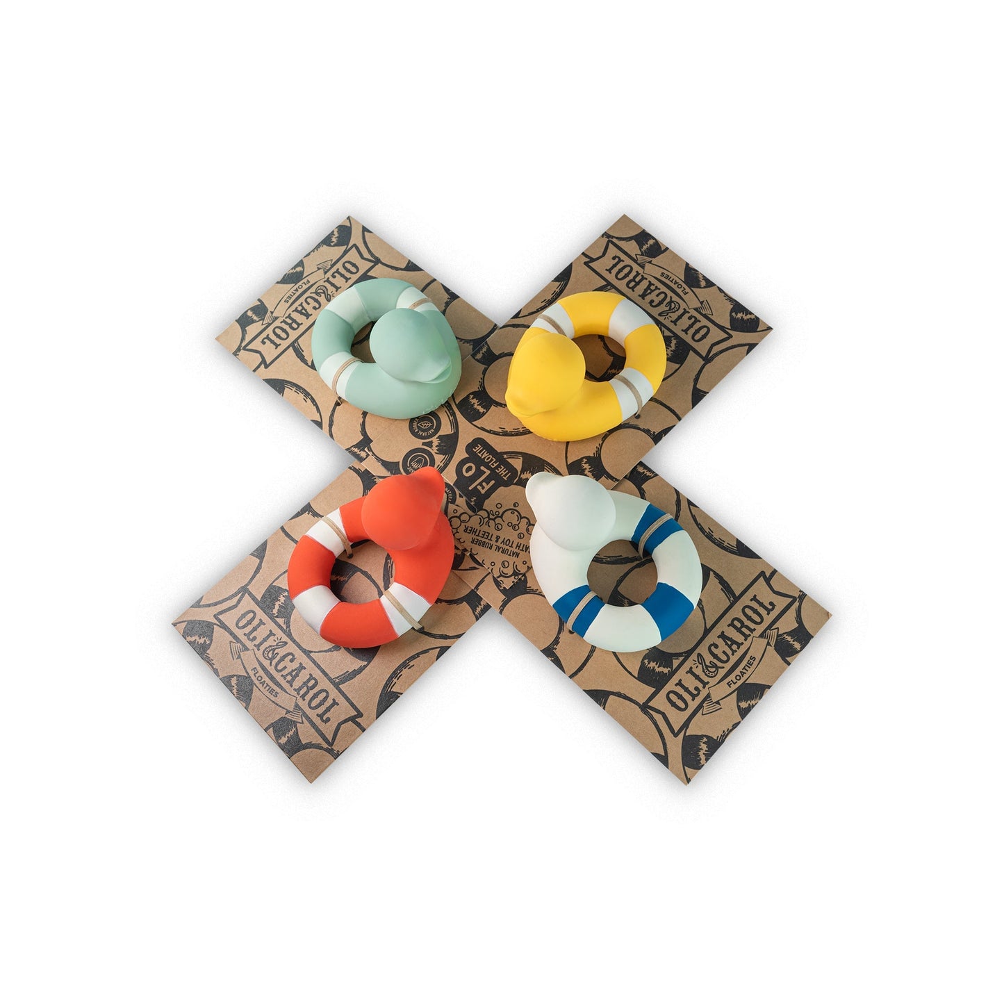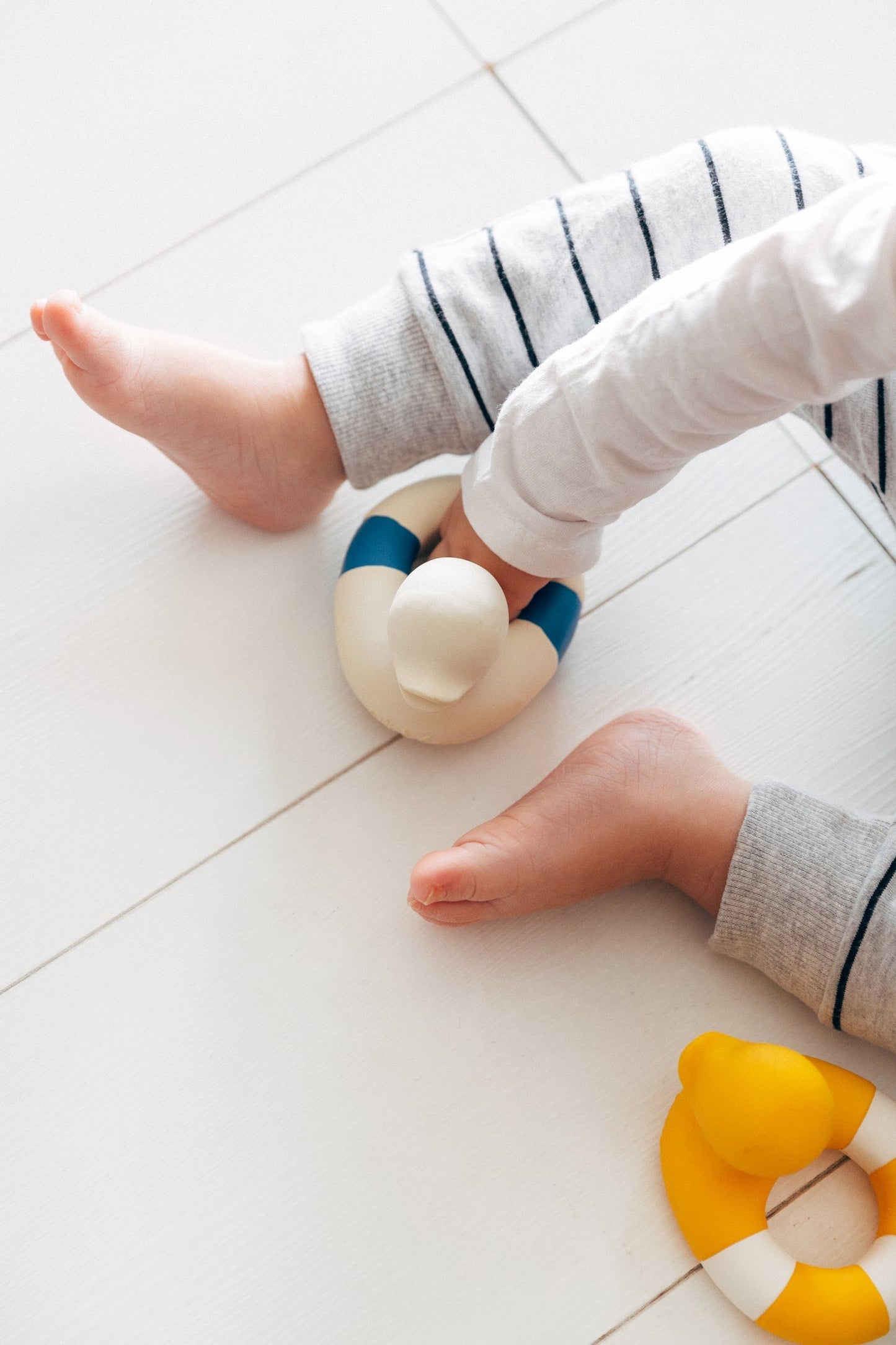 Inspirado na bóia clássica da linha de vida, Flo The Navy Blue é o novo pato moderno moderno em borracha natural de Oli & amp; Carol. Ele está pronto para acenar com as crianças na hora do banho! Também é perfeito como um brinquedo de dentes, como um brinquedo sensorial e como um objeto decorativo. É feito de um quarto individual sem orifícios, o que o torna 100% livre de bactérias.