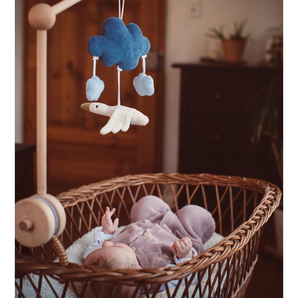 Le mobile charmant dans des tons de bleu délicats est un véritable accroche-regard dans chaque chambre d'enfant. Grâce à la boucle pratique sur le nuage bleu, il peut être facilement fixé partout - que ce soit sur le lit ou la poussette, il est toujours là. Mais les petits nuages et l'oie peuvent également être retirés individuellement et utilisés par exemple comme porte-clés. Les mouvements doux du mobile peuvent aider les enfants à se détendre et à s'endormir plus facilement.