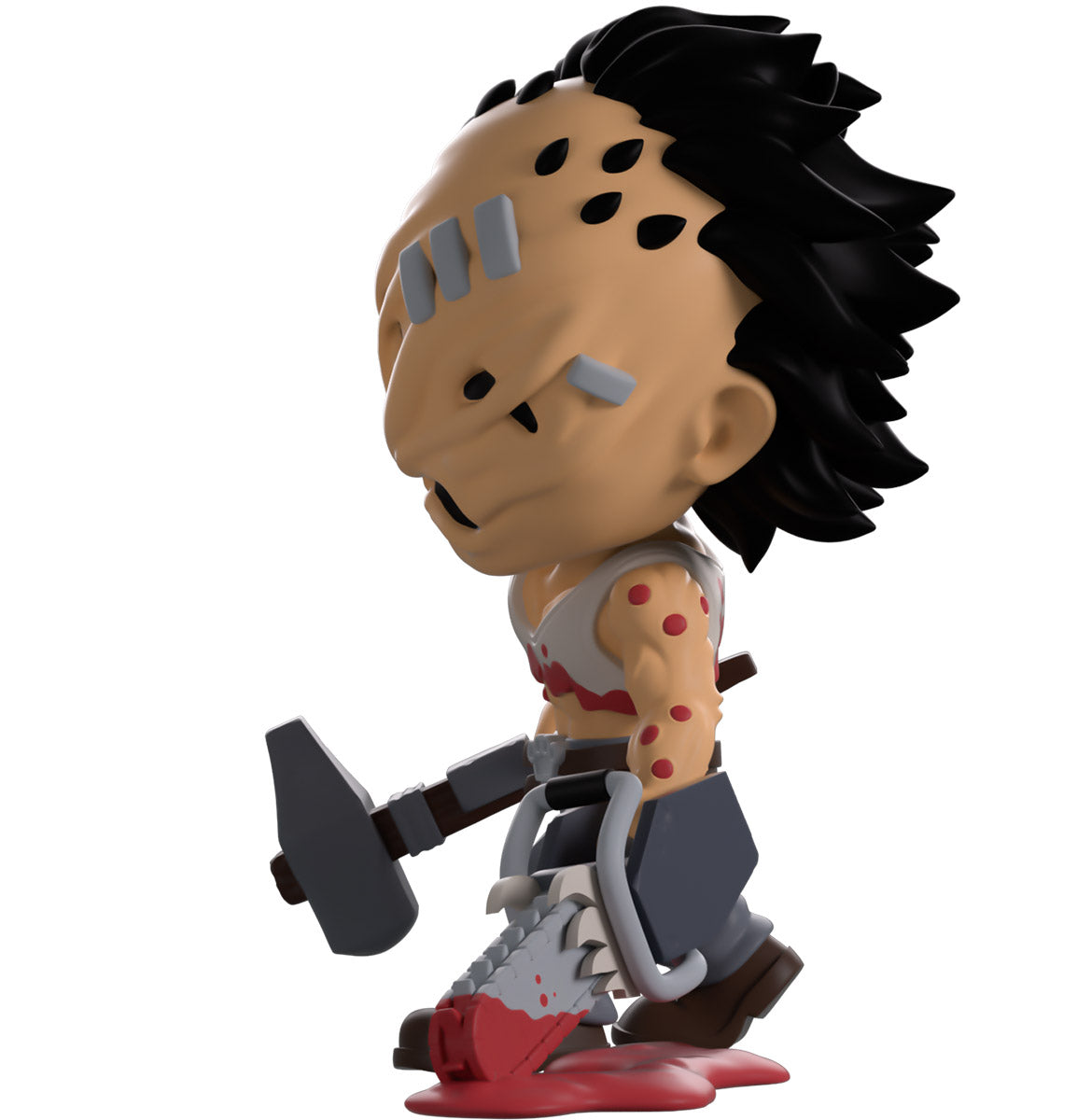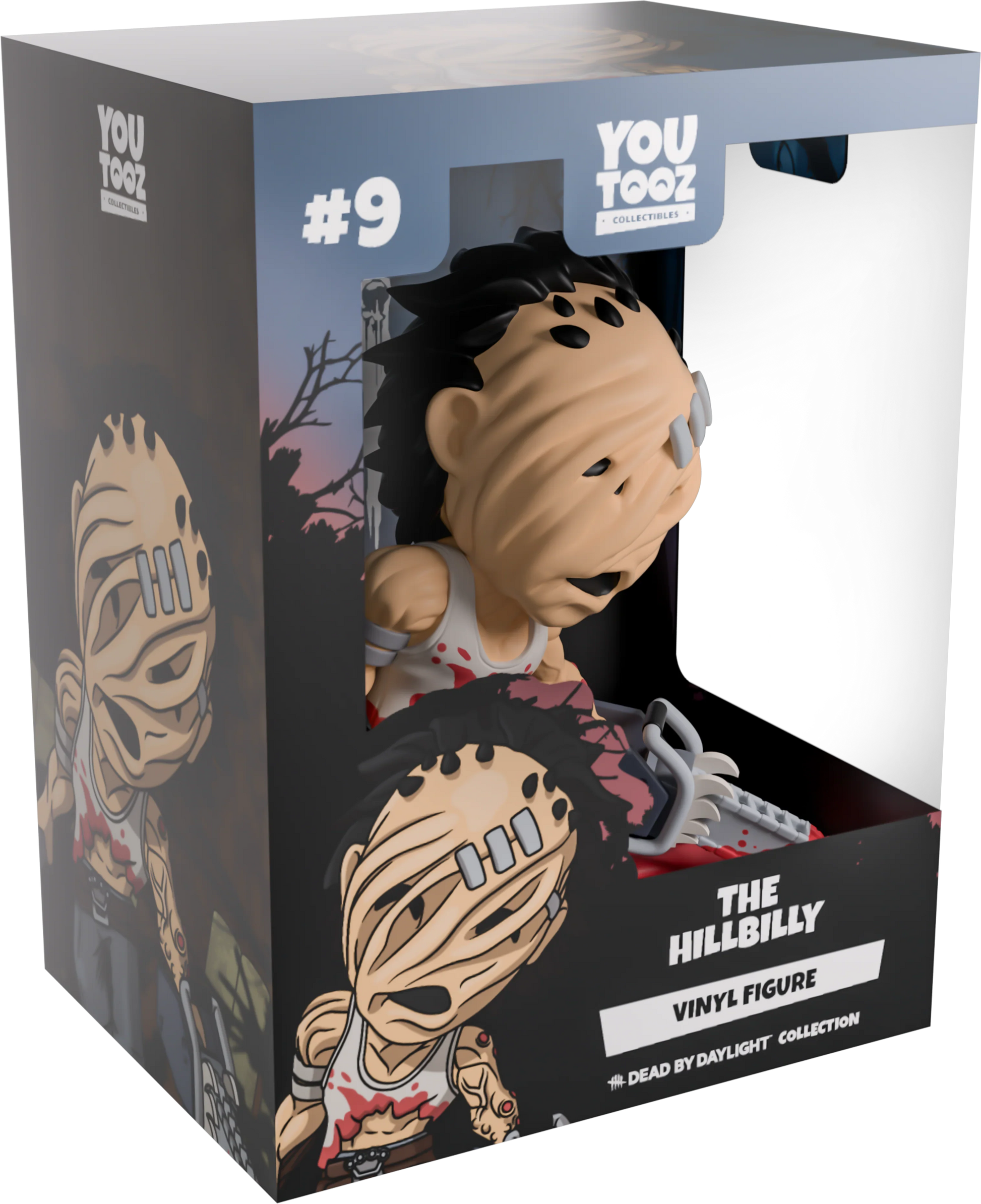 Le bruit d'une tronçonneuse n'est pas agréable, surtout lorsqu'il est suivi d'un cri à glacer le sang du Hillbilly ! Avec ses 11,2 cm de haut, ce tueur est sérieux alors qu'il avance d'un pas menaçant, le corps penché vers la gauche et traînant une tronçonneuse ensanglantée sur le sol. Dans sa main droite, il tient un lourd marteau de manière menaçante alors que son débardeur blanc est déchiré et ensanglanté sur un jean gris et des bottes noires. Avec son visage mutilé s'étirant en bosses grotesques pour rejoindre les cheveux noirs pointus à l'arrière de sa tête, d'épaisses agrafes grises sur son front le maintiennent ensemble. L'extérieur de son emballage le voit se cacher dans le fourré profond. Alors que l'intérieur est une forêt en silhouette noire avec une brume rouge et bleue brillante et le logo blanc « Dead by Daylight » à l'arrière, ce motif sinistre se poursuit ensuite sur la pochette de protection avec des arbres sombres qui l'entourent complètement tandis que leur silhouette peut être vue à travers la grande fenêtre transparente à l'avant. Cet objet de collection est livré dans une pochette extérieure protectrice mate et gaufrée et un protecteur en plastique de taille personnalisée pour une protection maximale pendant l'expédition.